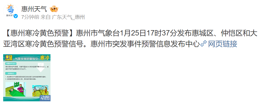 惠州發(fā)布寒冷黃色預(yù)警受強(qiáng)冷空氣影響,預(yù)計(jì)未來24小時(shí)我市氣溫明顯下降,海陸風(fēng)力增大,惠州市氣象臺(tái)1月25日17時(shí)37分發(fā)布惠城區(qū)、仲愷區(qū)和大亞灣區(qū)寒冷黃色預(yù)警信號(hào),請注意防御。惠州市突發(fā)事件預(yù)警信息發(fā)布中心