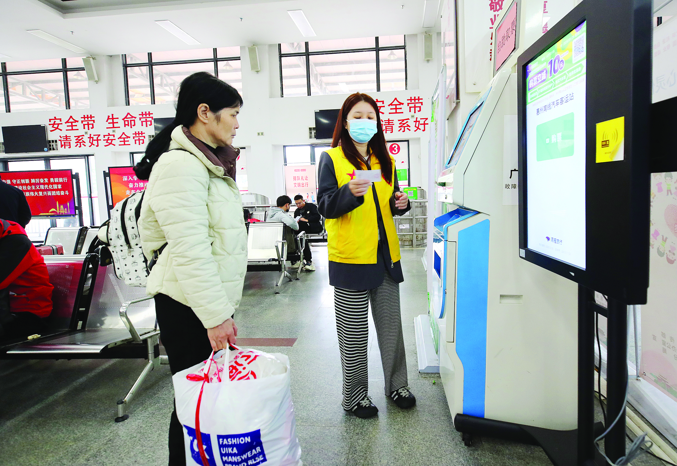 1月26日上午,惠州南線汽車客運(yùn)站,志愿者幫助指引乘客購票。