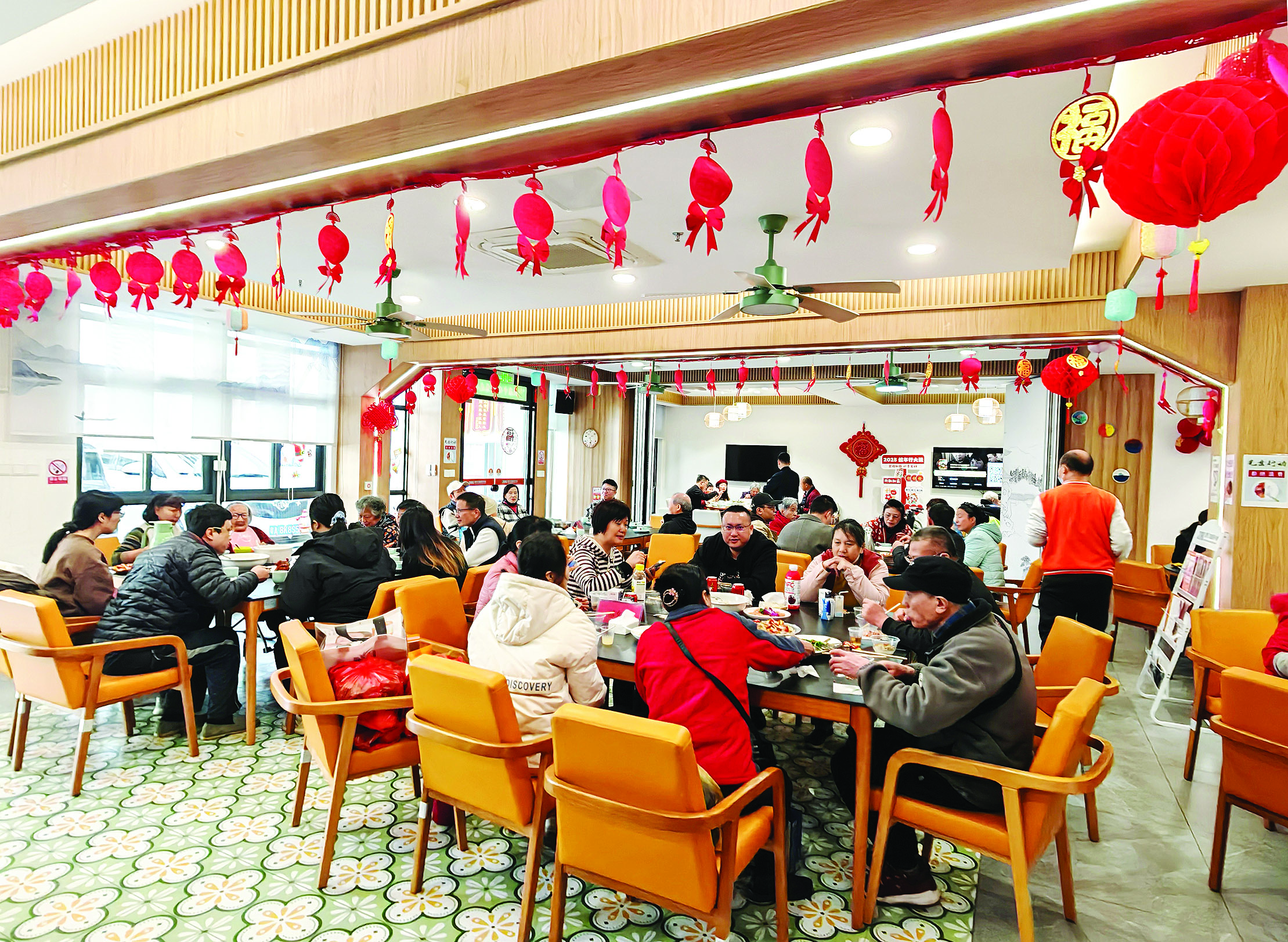 除夕中午,位于市區(qū)橋西的惠州市長者服務(wù)之家張燈結(jié)彩、年味濃郁,長者們精神矍鑠。午飯時間,工作人員陸續(xù)端上了魚、肉、蝦等豐盛菜品,長者們在家人的陪伴下有說有笑,共享美味,共敘天倫之樂。工作人員還穿上可愛的卡通蛇形人偶,給老人送上新春祝福。