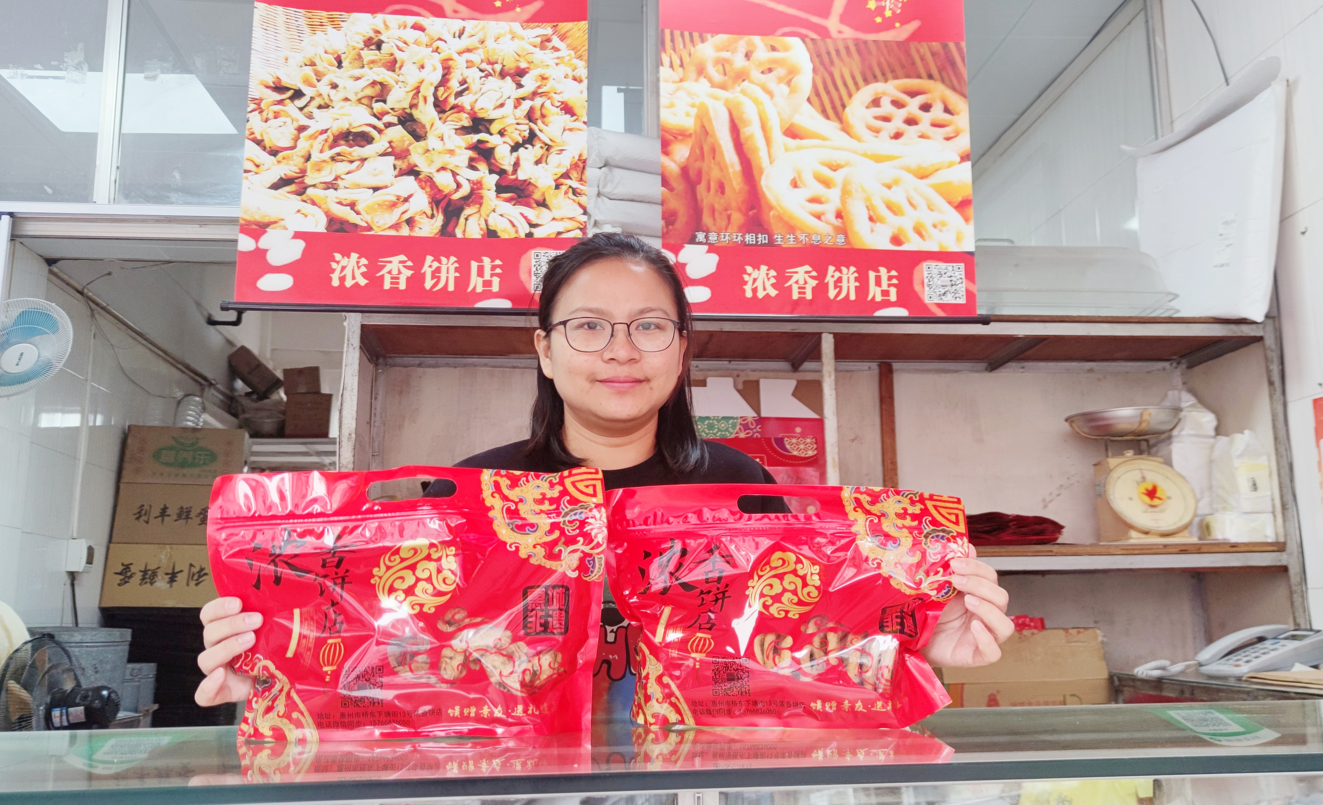 記者注意到,新搬遷的“濃香餅屋”門店裝飾一新,面積比原來(lái)老的門店增加了兩倍。鄧慧玲告訴記者,近年來(lái),前來(lái)采購(gòu)小吃的市民越來(lái)越多,原本的門店早已不能滿足生產(chǎn)需求。去年國(guó)慶,她另尋新址,將門店搬到了市區(qū)河南岸,采購(gòu)了2臺(tái)新的高效率壓面機(jī),一改原來(lái)透明塑料袋的包裝,設(shè)計(jì)有傳統(tǒng)文化元素的包裝,推出非遺禮盒套裝,另外還將產(chǎn)品放在惠州非遺館、部分民宿、酒店進(jìn)行展示。