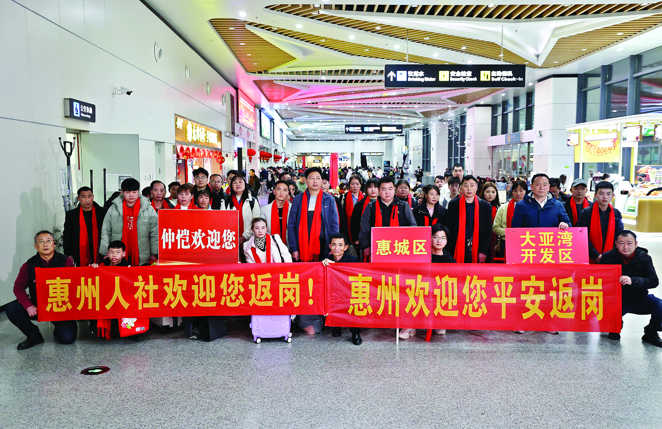 “惠州歡迎您平安返崗!”在平潭機(jī)場(chǎng)出站大廳,惠州市縣(區(qū))兩級(jí)人社部門工作人員拉起溫馨的橫幅,熱情地迎接返惠返崗的務(wù)工人員。