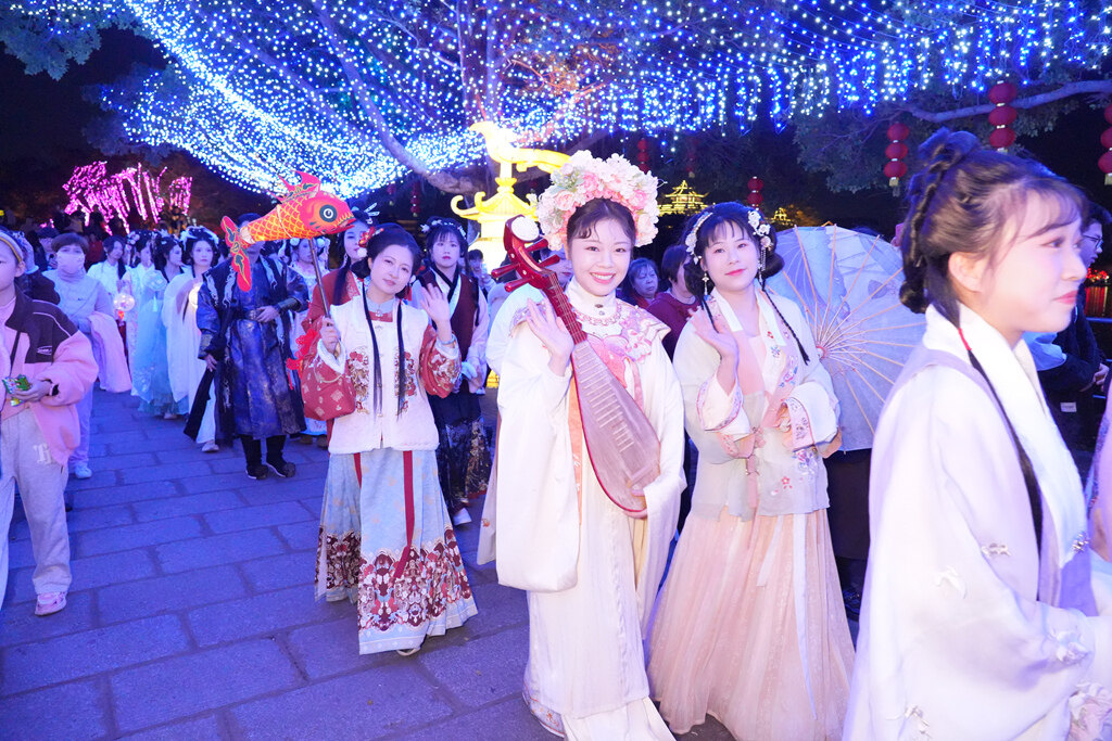 忽然,一陣悠揚(yáng)的絲竹聲傳來(lái),循聲望去,只見(jiàn)一群漢服小姐姐正舉著花燈巡游。