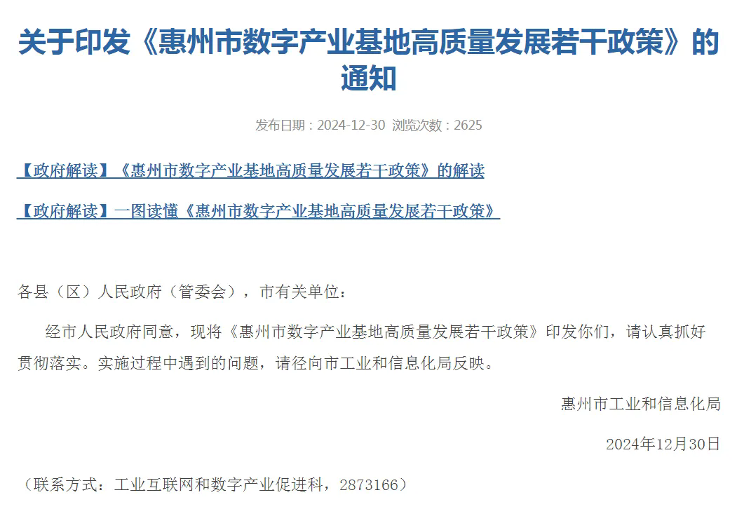 《惠州市數(shù)字產(chǎn)業(yè)基地高質(zhì)量發(fā)展若干政策》