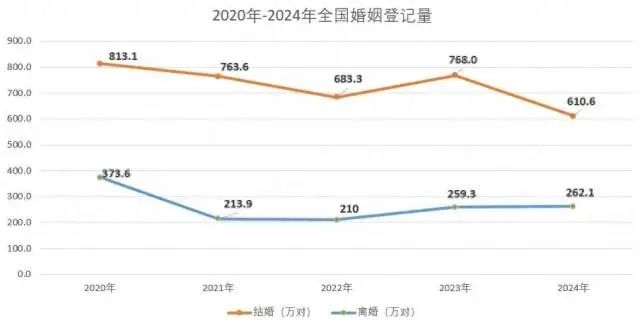 日前,民政部官網(wǎng)披露了2024年全國婚姻登記數(shù)據(jù)。民政部官網(wǎng)發(fā)布的《2024年4季度民政統(tǒng)計(jì)數(shù)據(jù)》顯示,2024年全國結(jié)婚登記數(shù)為610.6萬對(duì),離婚登記數(shù)為262.1萬對(duì)。2023年,全國結(jié)婚登記數(shù)為768.0萬對(duì),離婚登記數(shù)為259.3萬對(duì),同比分別下降約20.5%、上升約1.1%。