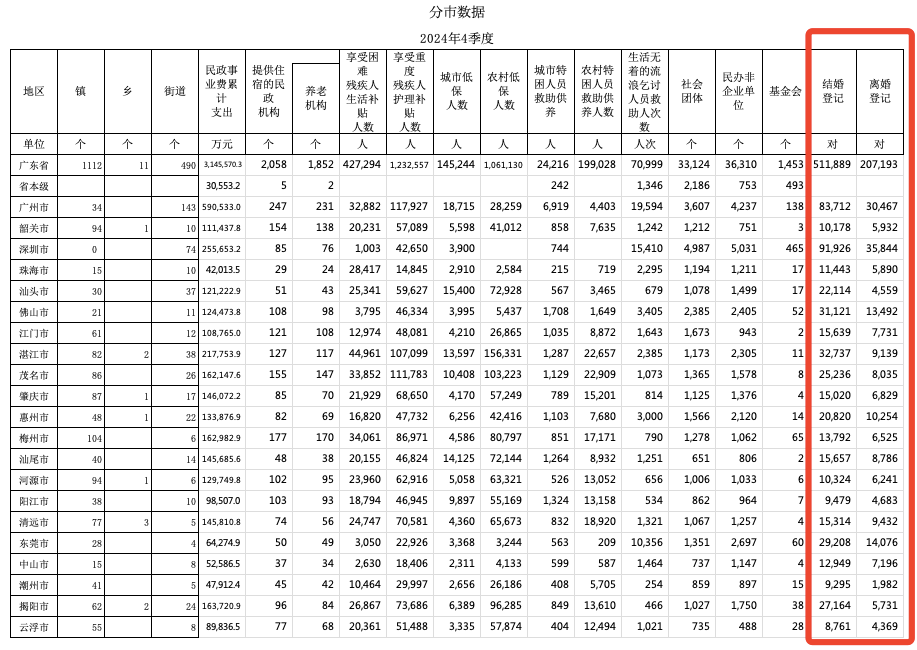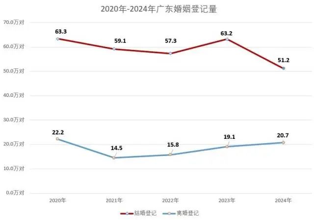 據(jù)廣東民政事業(yè)統(tǒng)計(jì)季報(bào)(2024年第四季度),2024年廣東結(jié)婚登記數(shù)為51.2萬對(duì),較2023年(63.2萬對(duì))減少約19.0%;離婚登記20.7萬對(duì),較2023年(19.1萬對(duì))有所上漲。