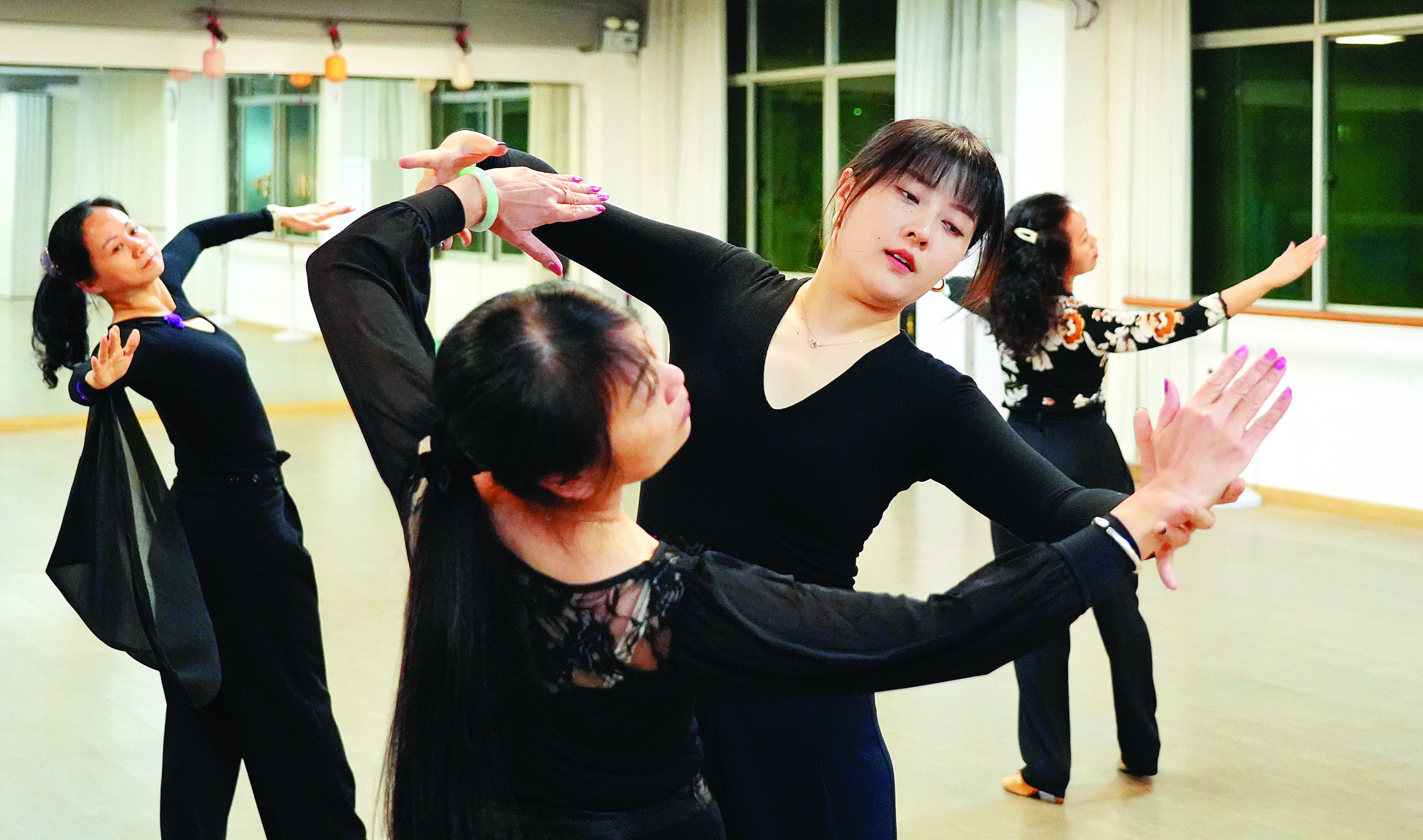 國(guó)標(biāo)舞老師黃嘉文(右二)在指導(dǎo)學(xué)員練習(xí)。 惠州日?qǐng)?bào)記者朱金贊 攝