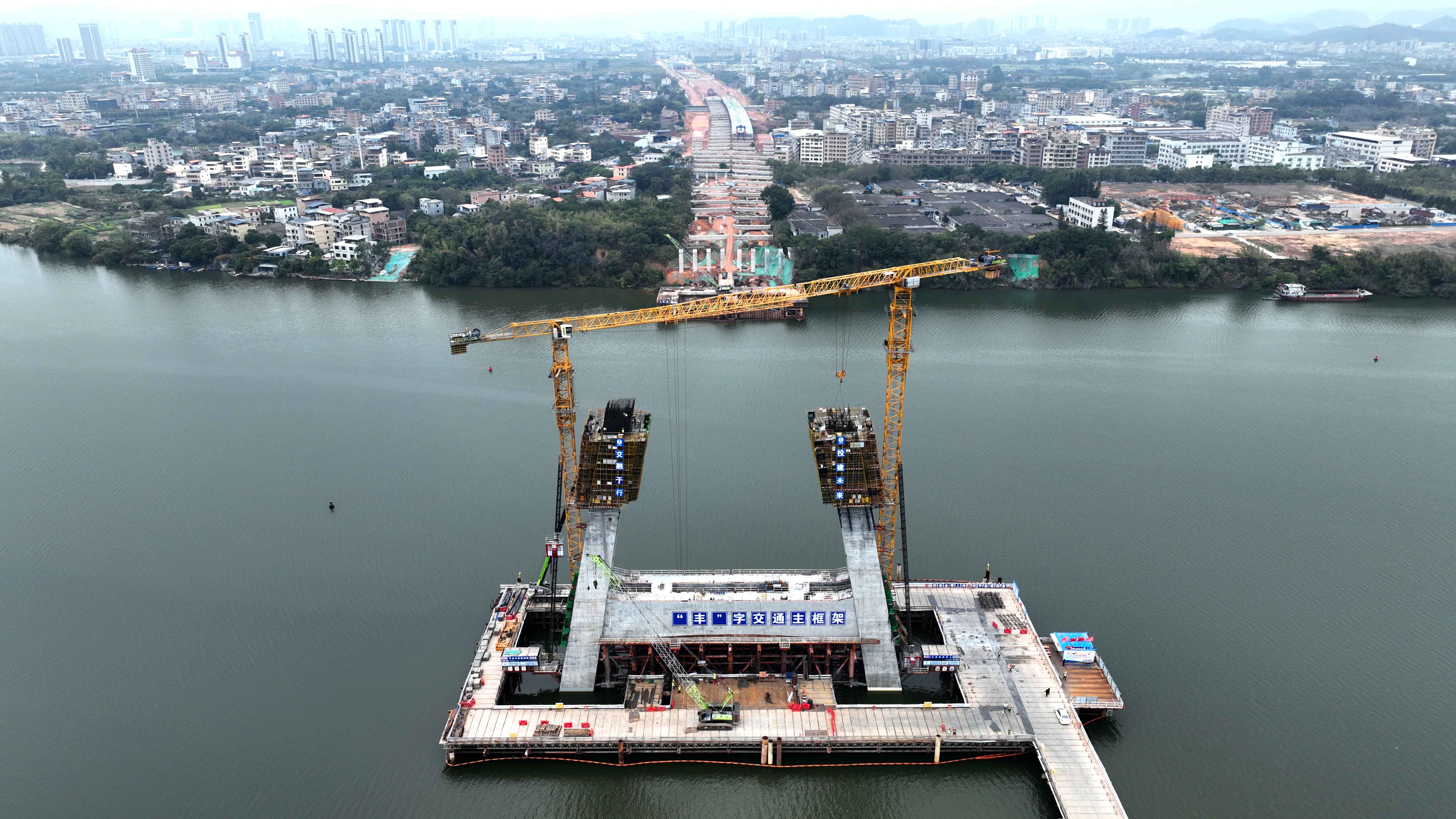 “豐”字交通主框架1號(hào)公路(惠霞高速)汝湖段跨東江特大橋施工現(xiàn)場(chǎng)。