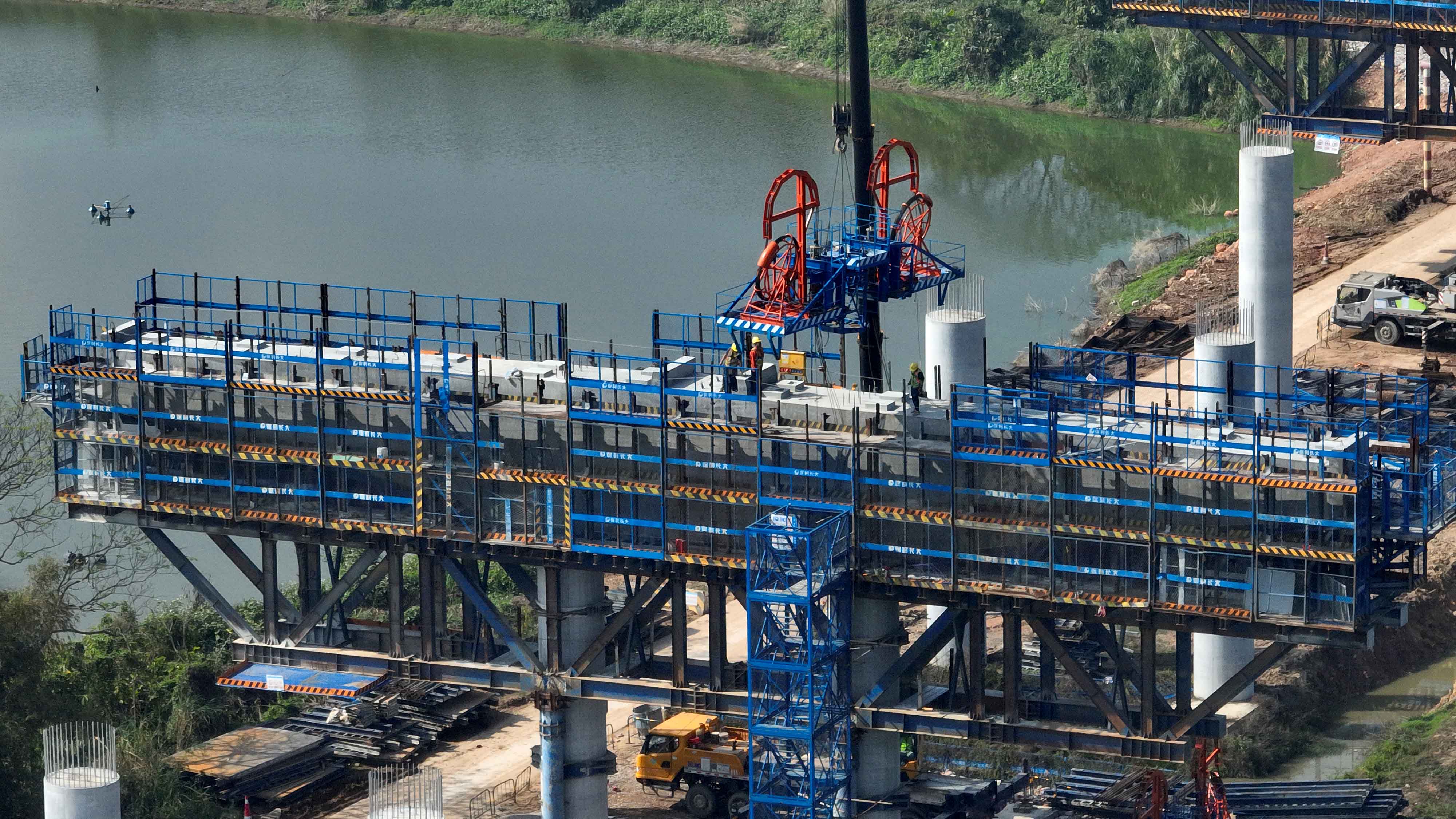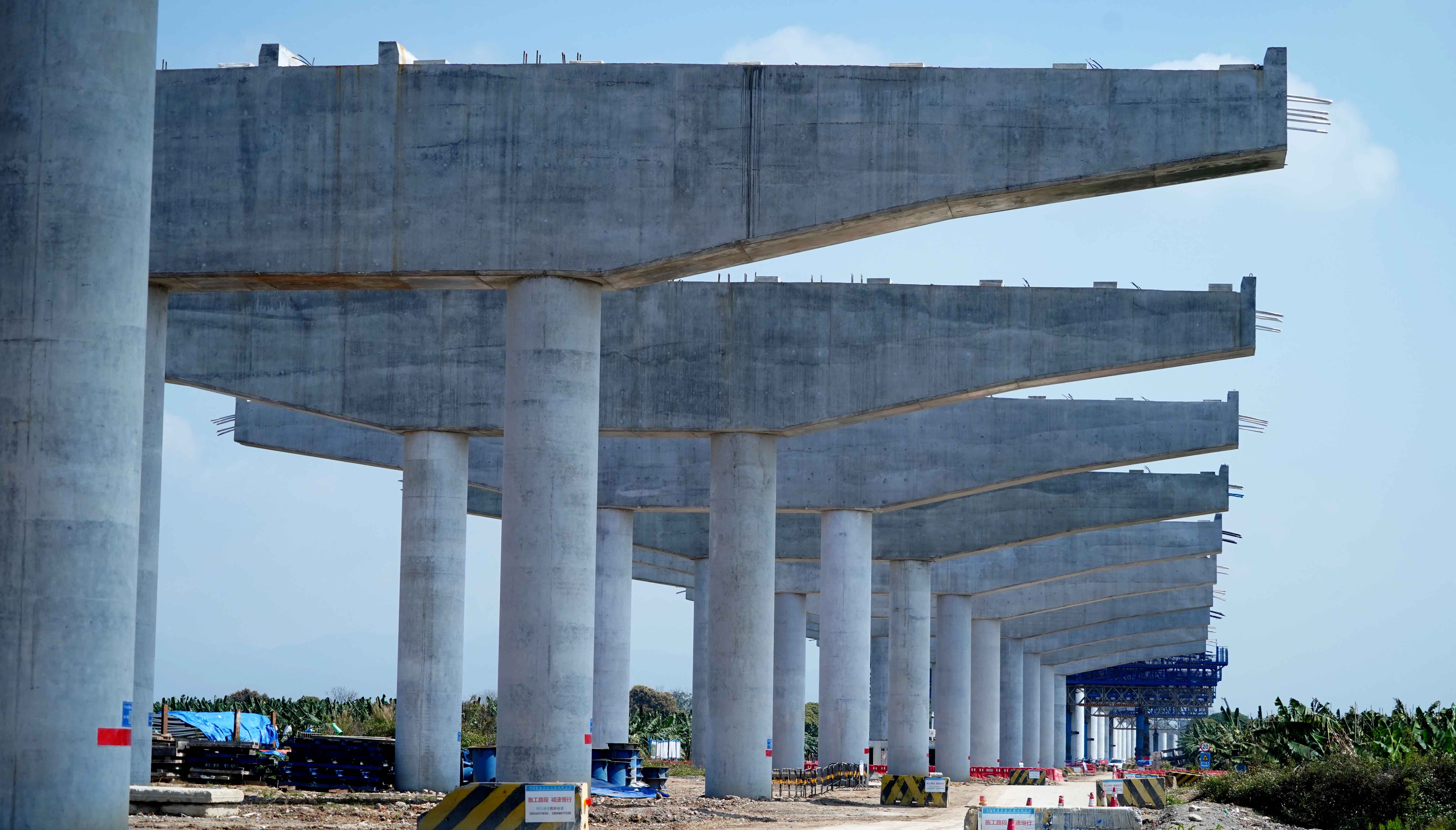 作為1號(hào)公路兩座跨江大橋之一,位于惠城區(qū)馬安鎮(zhèn)的西枝江大橋正在進(jìn)行現(xiàn)澆梁支架施工。大橋全長(zhǎng)613米,雙向八車道,并在兩側(cè)設(shè)置非機(jī)動(dòng)車道和人行道。施工現(xiàn)場(chǎng),數(shù)十名工人正在綁扎支架,惠灣高速公路有限公司工程管理部經(jīng)理李秋平介紹,西枝江大橋于2023年初開工建設(shè),目前橋梁樁基、承臺(tái)、墩柱、蓋梁已完成。