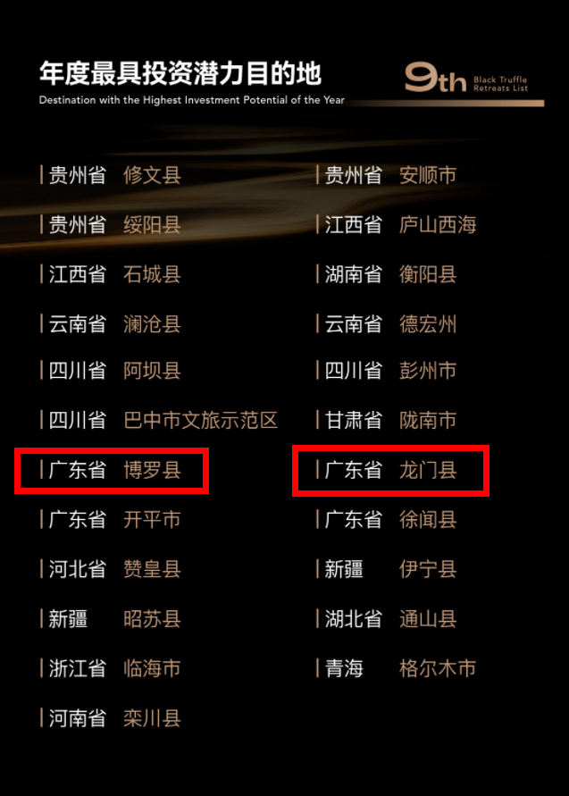 根據(jù)發(fā)布內(nèi)容,博羅縣、龍門縣入選第九屆黑松露獎“年度最具投資潛力目的地”,龍門縣愛樹·南昆秘境、花溪雨玉石溫泉民宿和博羅縣璞若山居民宿、慢享欖園度假民宿、浮生六季·望山民宿等5間民宿入選“年度精品民宿榜”。