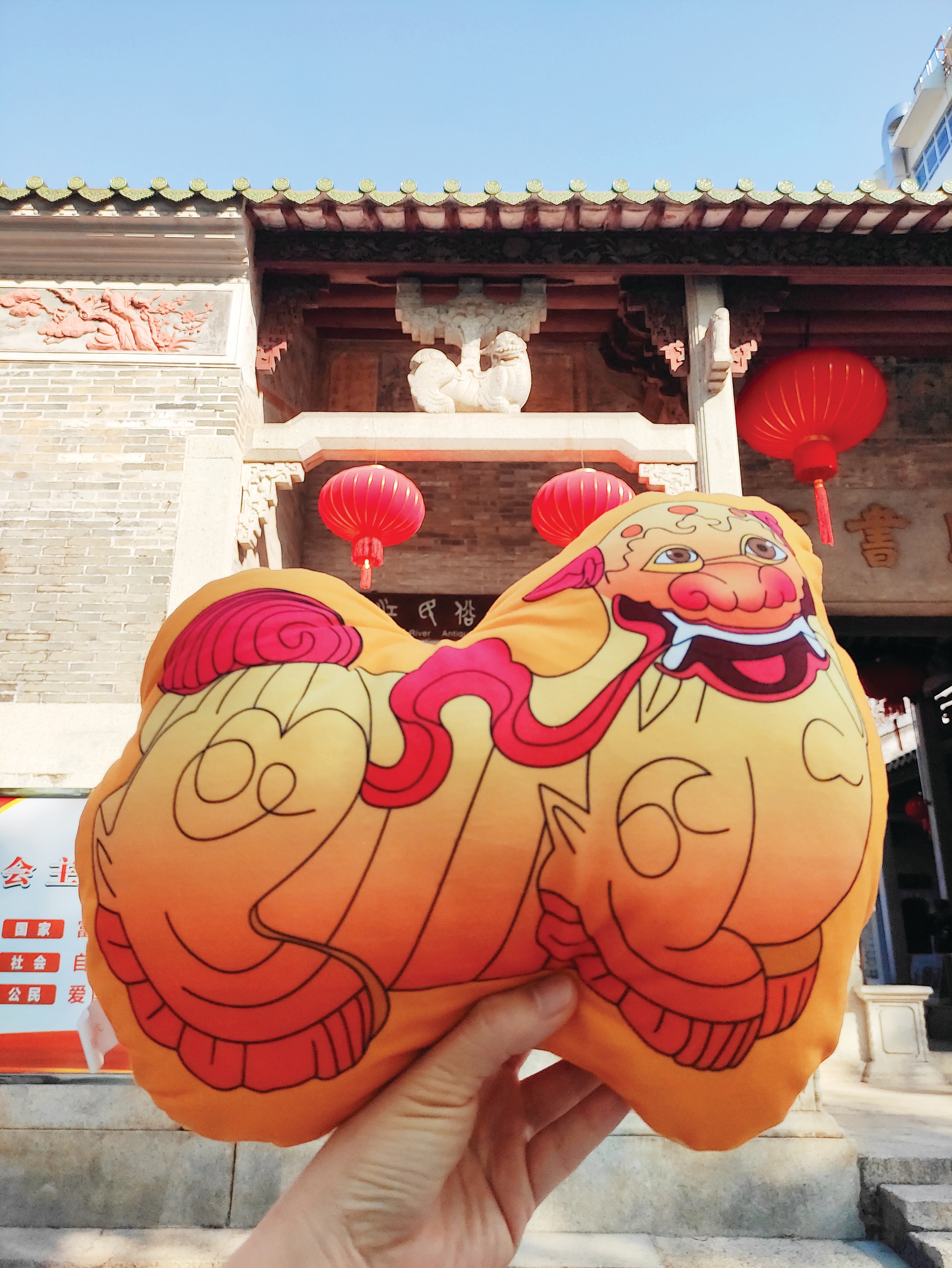 “丑萌丑萌”的貔貅瑞獸抱枕,讓人忍不住多拿捏幾把。這抱枕的原型為黃氏書室大門兩側(cè)建筑上的構(gòu)件石墩——辟邪獸貔貅。貔貅為獅形、有角、有翼,是中國古代神話里的一種神獸,象征著“仁”與“瑞”,古人相信它能招財聚寶、帶來好運。這一款抱枕,將貔貅這一瑞獸形象卡通化,使其顯得奇趣可愛。