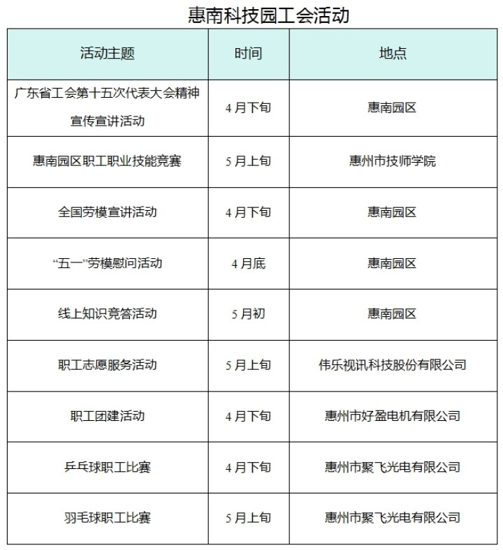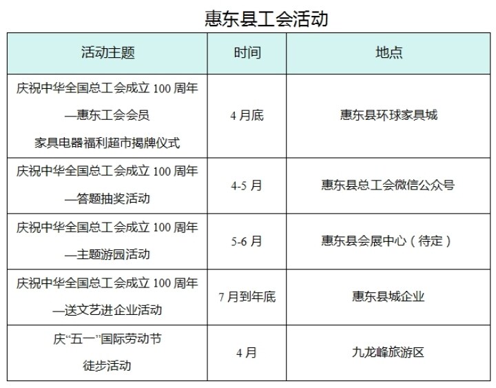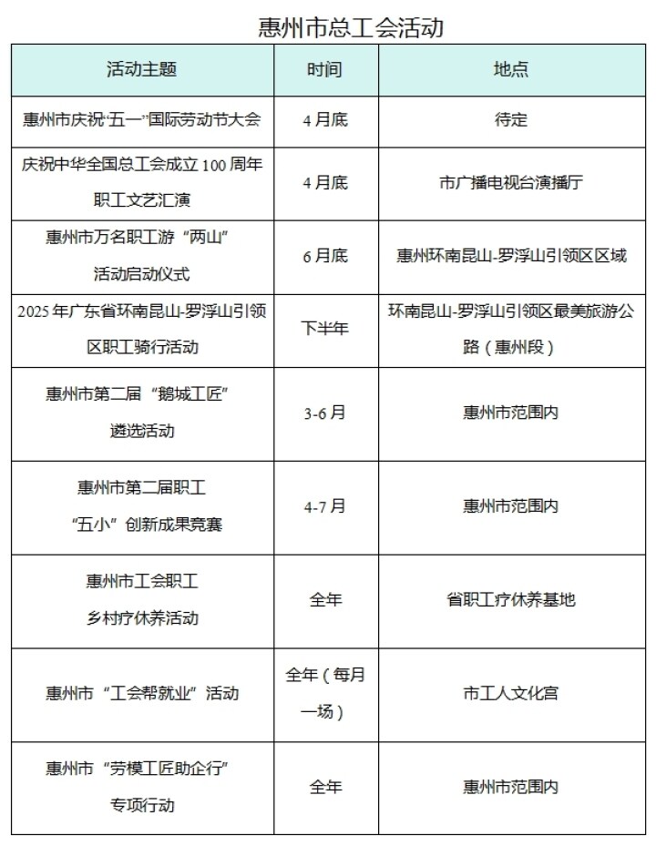 市級層面,市總工會(huì)精心策劃了多項(xiàng)活動(dòng)——慶祝“五一”國際勞動(dòng)節(jié)大會(huì)(4月底)將表彰先進(jìn)、凝聚共識;職工文藝匯演(4月底)以藝術(shù)形式展現(xiàn)百年工運(yùn)風(fēng)采;職工演講比賽(4~5月)打造“過去-現(xiàn)在-未來”三大時(shí)空對話,回首工會(huì)百年歷程;勞模工匠風(fēng)采暨職工攝影展(5月中旬)旨在展示我市各行各業(yè)勞模工匠風(fēng)采,大力弘揚(yáng)勞模精神、勞動(dòng)精神、工匠精神,發(fā)現(xiàn)勞動(dòng)之美、生活之美、惠州之美;萬名職工游南昆山、羅浮山(6月底)串聯(lián)惠州生態(tài)美景,倡導(dǎo)健康生活。