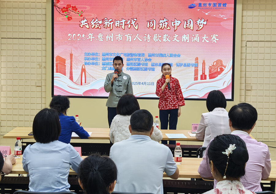 惠州日報(bào)訊 (記者龔妍 譚琳 通訊員李海雄 藍(lán)勇)4月11日,“共繪新時(shí)代 同筑中國夢”2025惠州市盲人詩歌散文朗誦大賽在惠州市圖書館圓滿落幕。在“世界讀書日”前夕,12名視障選手以聲音為筆,描繪出充滿溫度的藝術(shù)畫卷,贏得現(xiàn)場觀眾的熱烈掌聲。