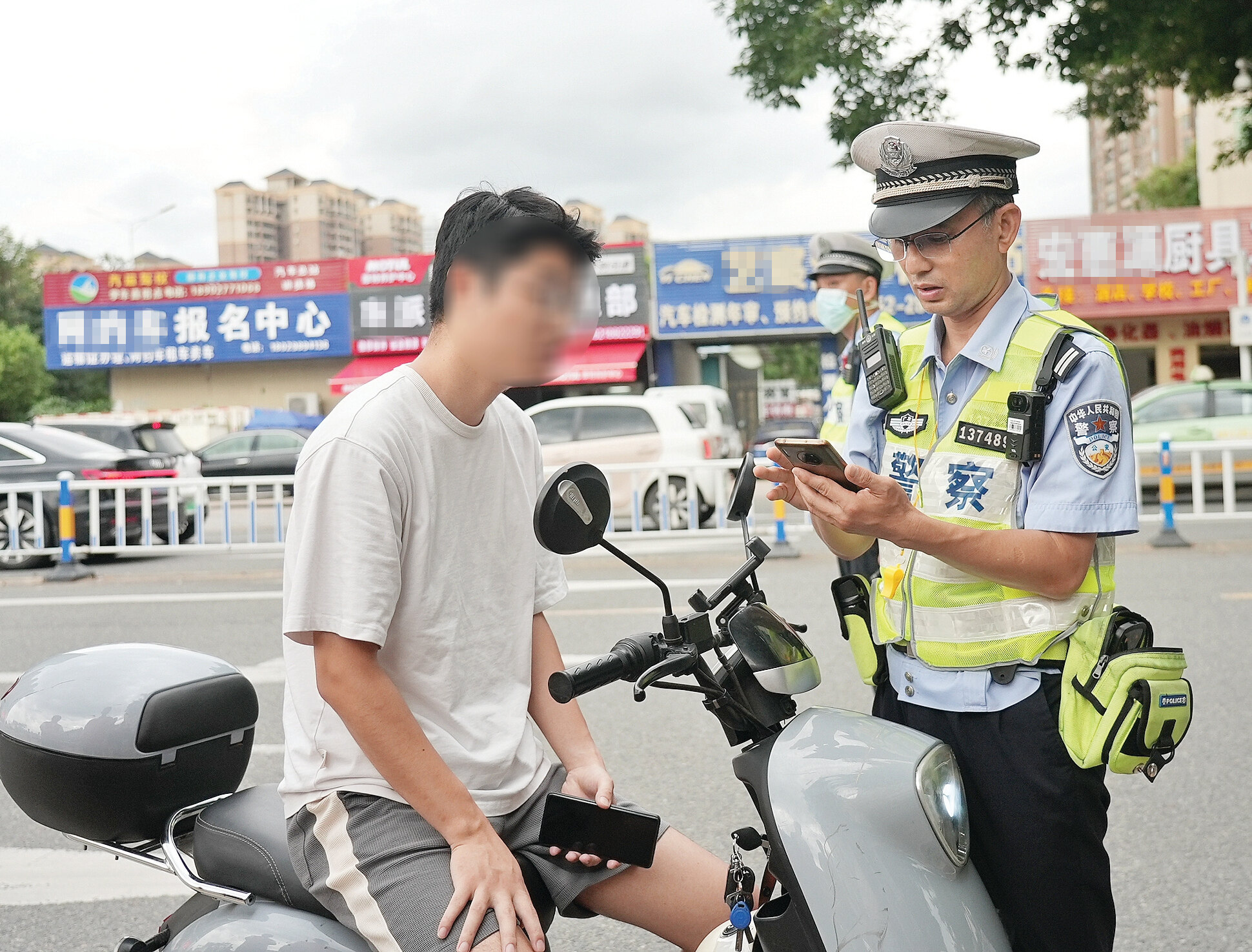 執(zhí)勤交警對(duì)不戴頭盔者進(jìn)行宣教勸導(dǎo)。
