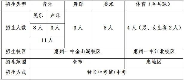 2025年惠州市第一中學(xué)金山湖校區(qū)計劃面向全市2025屆初中應(yīng)屆畢業(yè)生招收美術(shù)8人、音樂11人、舞蹈3人;惠州市第一中學(xué)江北校區(qū)計劃面向惠城區(qū)2025屆初中應(yīng)屆畢業(yè)生招收體育特長生(乒乓球)4人。