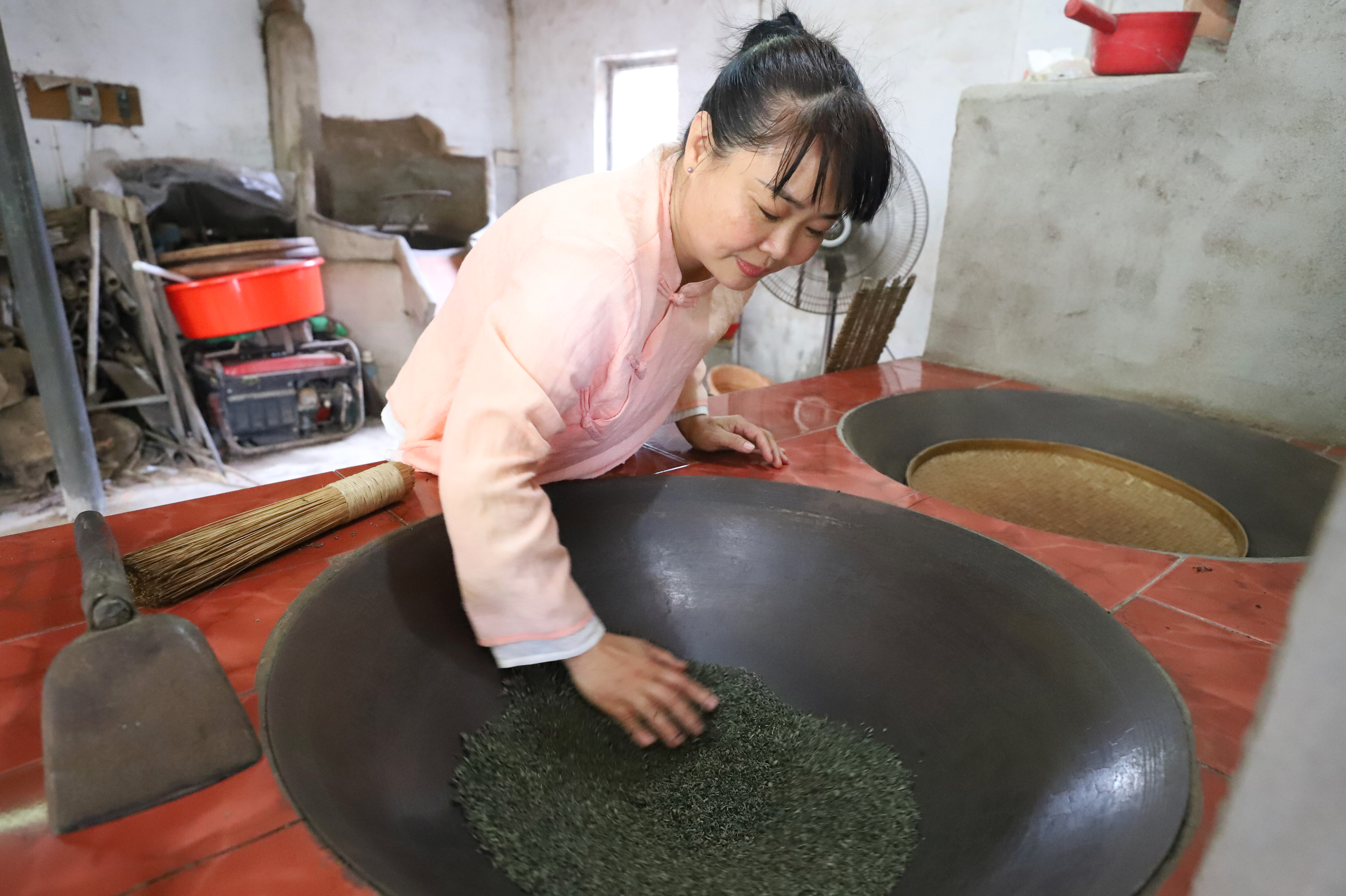手工炒茶,需要用柴火。“茶是很容易吸味的,用柴也很有講究。”她說,炒茶時(shí),不會(huì)用桉樹、樟樹這些味道比較重的柴火,多用荔枝木、龍眼木等。在殺青時(shí),炒茶鍋的溫度很高,稍不留神手腕也會(huì)被燙起泡。“殺青的時(shí)候,動(dòng)作要快,要用手不停地翻動(dòng),這也很關(guān)鍵,不然茶青容易粘鍋。”