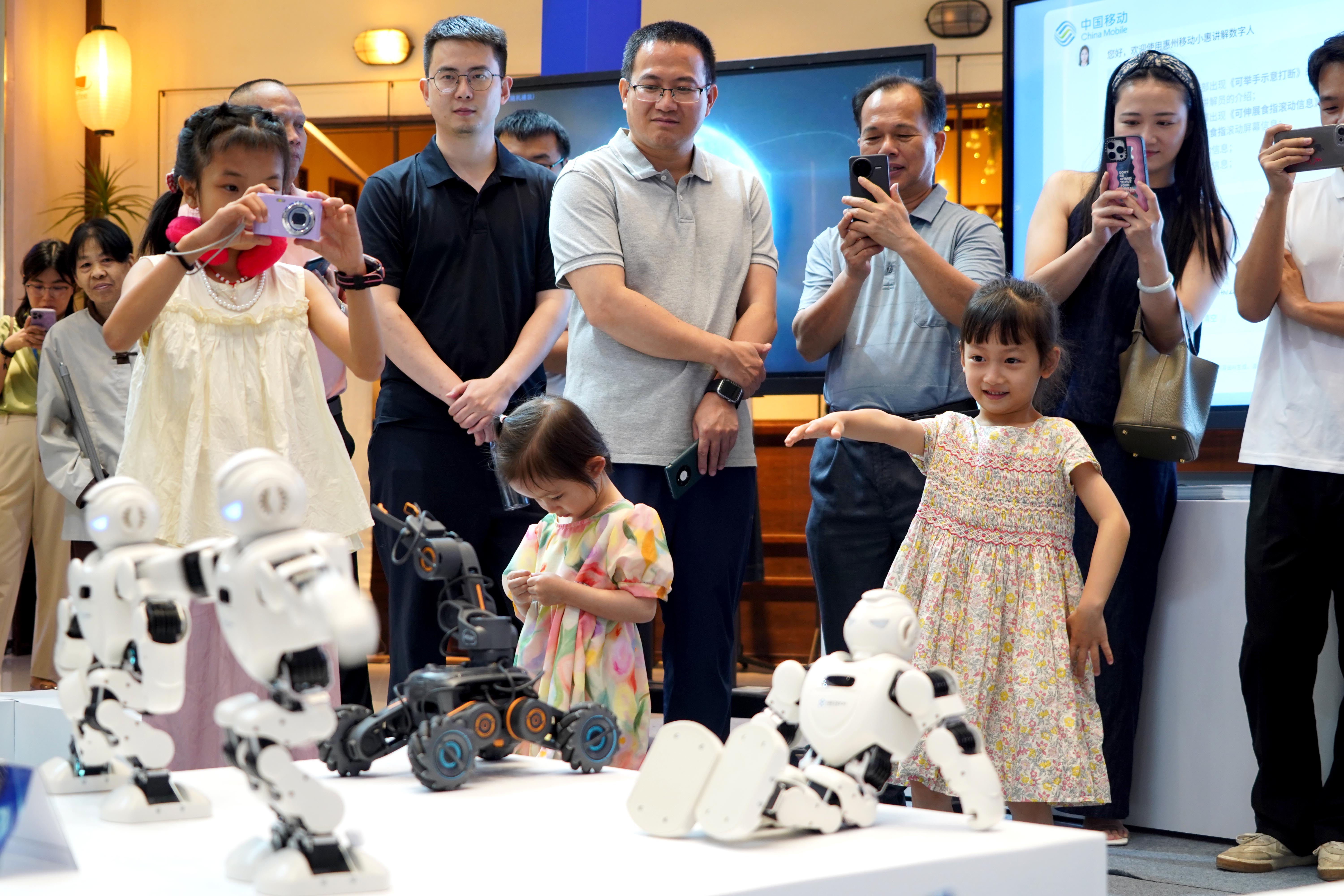 幾名小朋友在會(huì)跳舞的AI機(jī)器狗表演結(jié)束后,主動(dòng)上前與AI機(jī)器狗握手,用稚嫩的小手感受AI科技。 惠州日?qǐng)?bào)記者李松權(quán) 攝