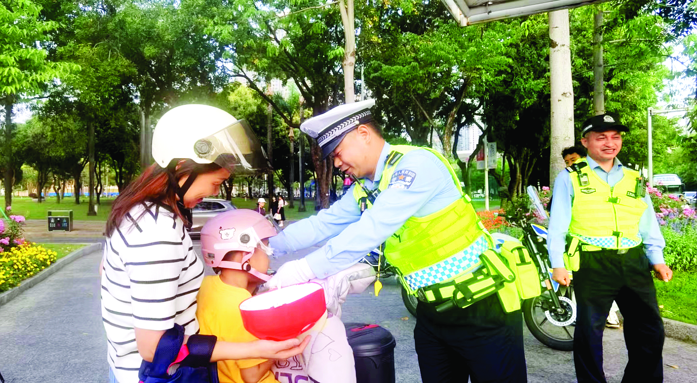 惠州交警開展送安全頭盔活動,增強群眾安全意識。