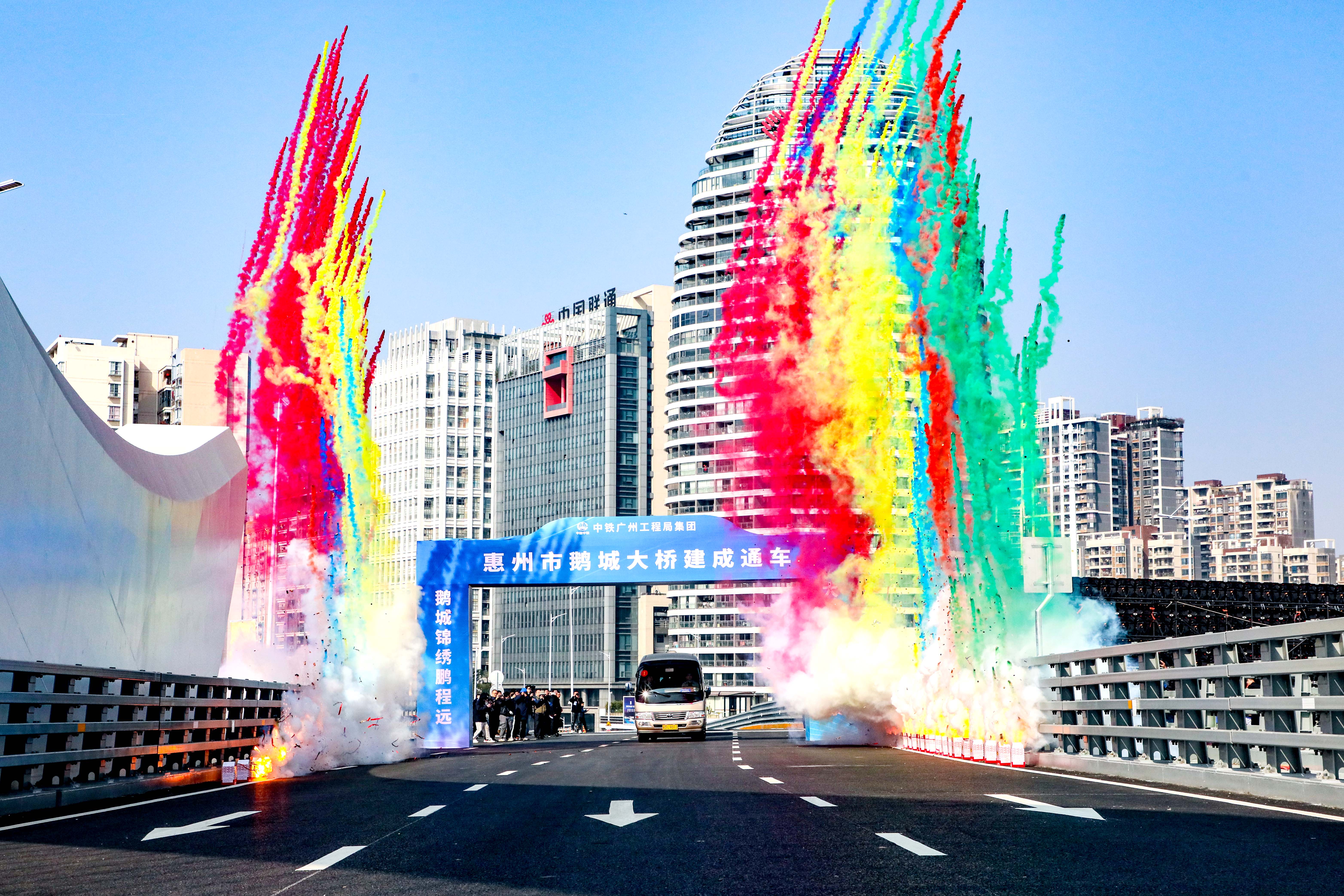 2024年12月28日上午,在一陣禮炮聲中,由中鐵廣州工程局承建的惠州鵝城大橋正式通車。鵝城大橋是惠州首座斜跨異型拱橋,也是市區(qū)第7座跨東江大橋。大橋通車后,有效緩解了東江大橋、隆生大橋的交通壓力,加快形成城市東聯(lián)、南接快速通道,成為聯(lián)動?xùn)|江兩岸惠民興業(yè)的新動脈。