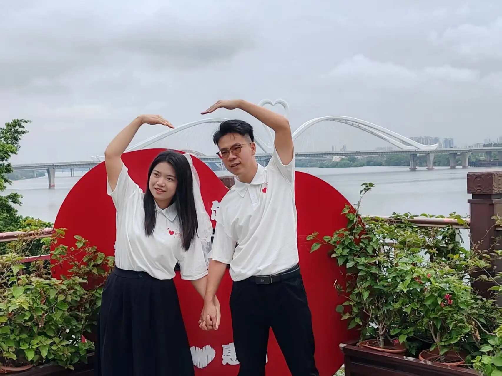 4月19日上午,新人們?cè)诨葜菪碌貥?biāo)打卡點(diǎn)鵝城大橋打卡點(diǎn)拍攝寫真照片及活動(dòng)宣傳短片。