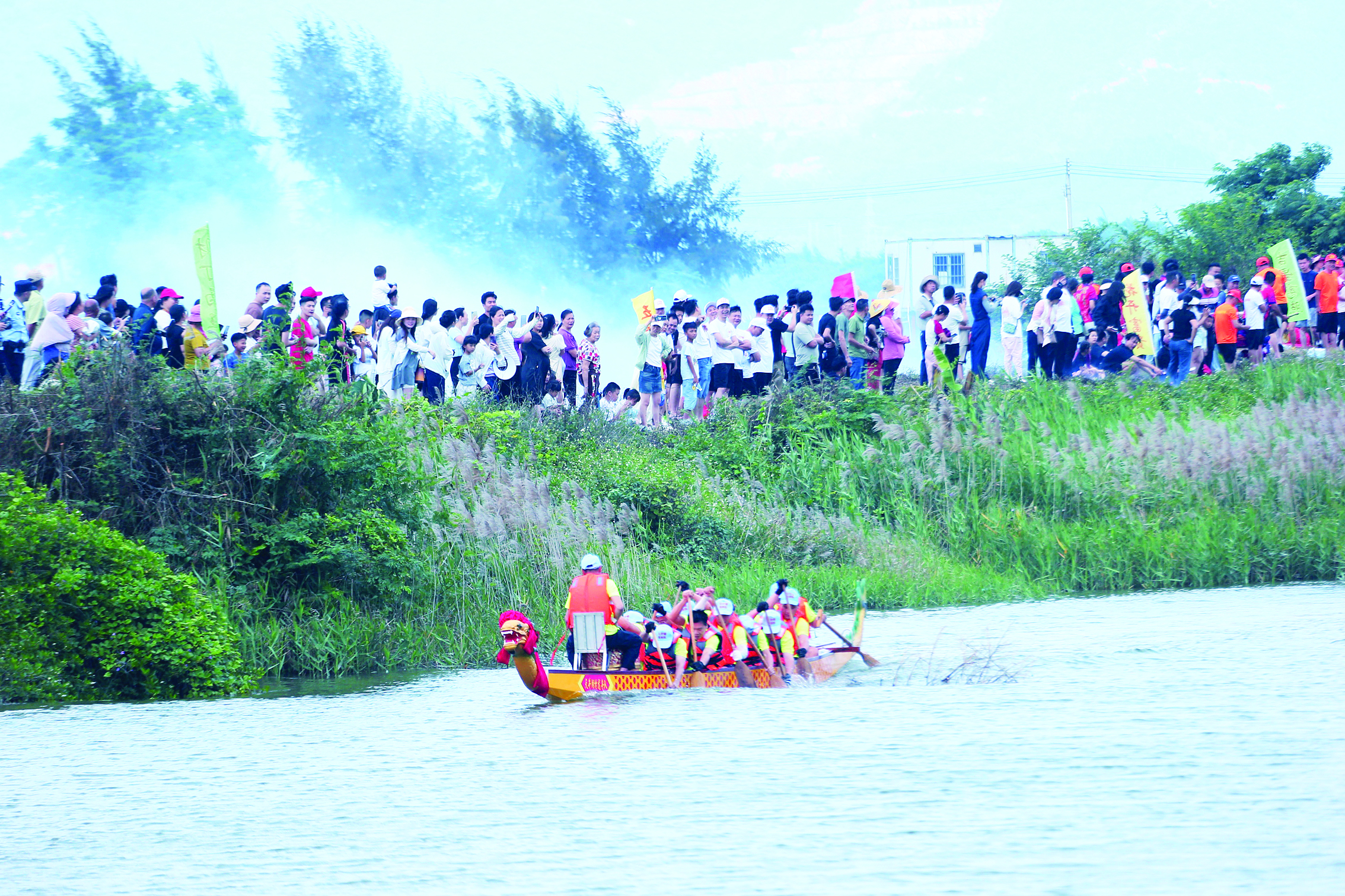 市民在岸邊為參賽隊(duì)伍加油鼓勁。