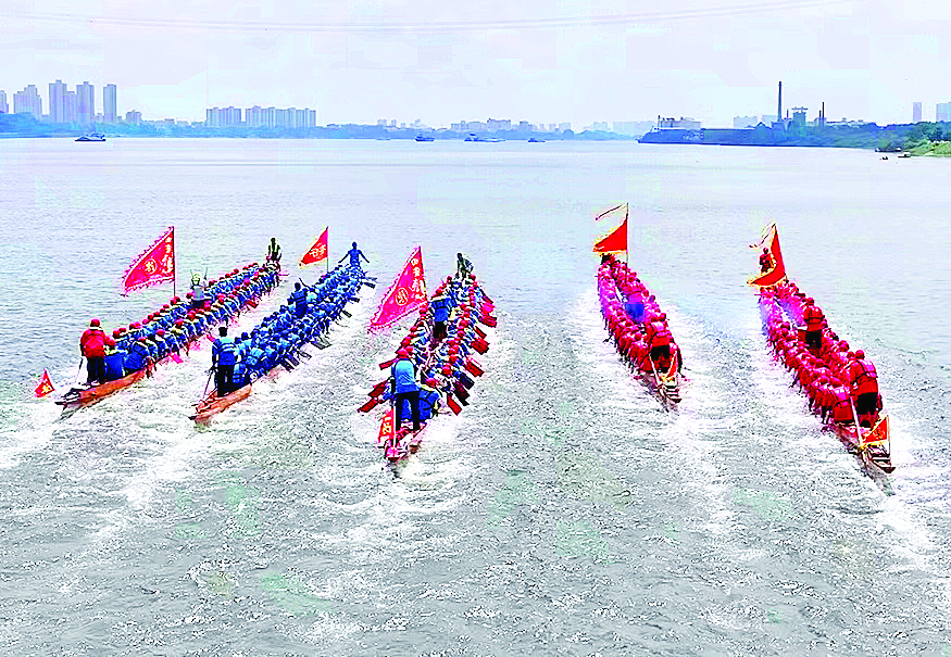 蓄勢(shì)已久的龍舟,如離弦之箭飛馳而出,參賽隊(duì)員們齊心揮槳擊浪,飛濺的水花與渾厚有力的鼓點(diǎn)聲交織,將“精誠(chéng)團(tuán)結(jié)、拼搏進(jìn)取,同舟共濟(jì)、力爭(zhēng)上游”的龍舟精神展現(xiàn)得淋漓盡致。