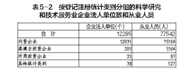 在科學(xué)研究和技術(shù)服務(wù)業(yè)企業(yè)法人單位從業(yè)人員中,內(nèi)資企業(yè)占97.7%,港澳臺投資企業(yè)占2.0%,外商投資企業(yè)占0.1%(詳見表5-2)。