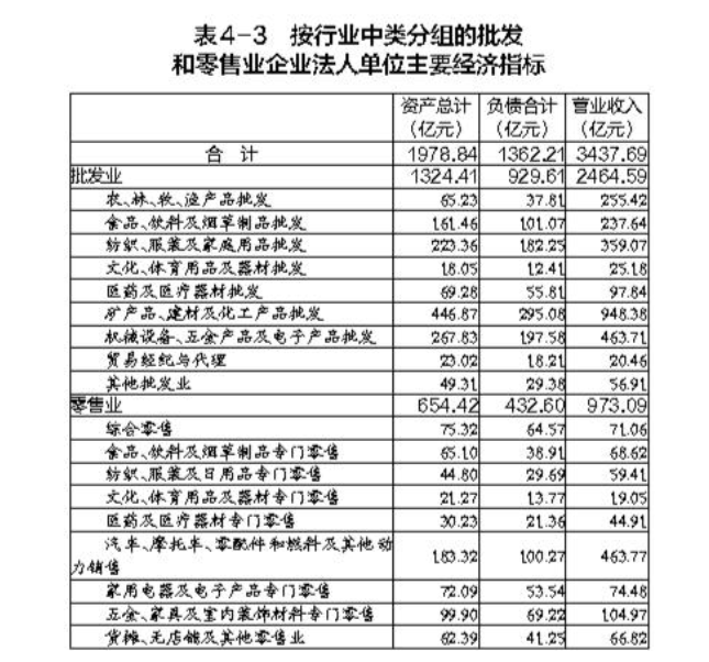 在批發(fā)和零售業(yè)企業(yè)法人單位中,批發(fā)業(yè)占37.7%,零售業(yè)占62.3%。在批發(fā)和零售業(yè)企業(yè)法人單位從業(yè)人員中,批發(fā)業(yè)占46.6%,零售業(yè)占53.4%(詳見表4-1)。