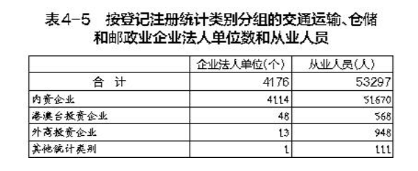 在交通運輸、倉儲和郵政業(yè)企業(yè)法人單位從業(yè)人員中,內(nèi)資企業(yè)占97.0%,港澳臺投資企業(yè)占1.2%,外商投資企業(yè)占1.8%(詳見表4-5)。
