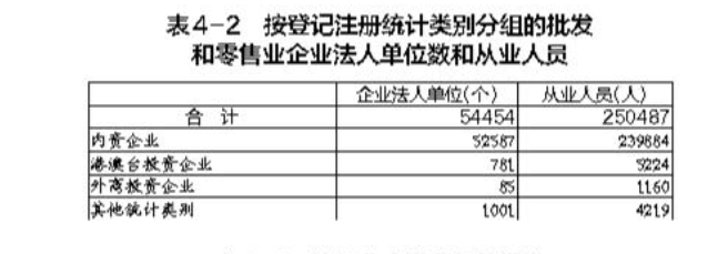 在批發(fā)和零售業(yè)企業(yè)法人單位從業(yè)人員中,內(nèi)資企業(yè)占95.8%,港澳臺投資企業(yè)占2.1%,外商投資企業(yè)占0.5%(詳見表4-2)。
