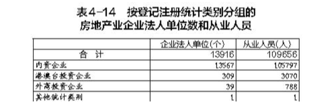 在房地產(chǎn)業(yè)企業(yè)法人單位從業(yè)人員中,內(nèi)資企業(yè)占96.5%,港澳臺投資企業(yè)占2.8%,外商投資企業(yè)占0.7%(詳見表4-14)。