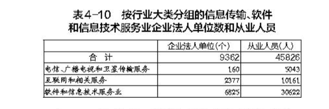 2023年末,全市共有信息傳輸、軟件和信息技術(shù)服務(wù)業(yè)企業(yè)法人單位9362個,從業(yè)人員45826人,分別比2018年末增長141.8%和102.7%(詳見表4-10)。