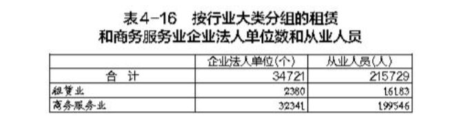 在租賃和商務(wù)服務(wù)業(yè)企業(yè)法人單位中,租賃業(yè)占6.9%,商務(wù)服務(wù)業(yè)占93.1%。在租賃和商務(wù)服務(wù)業(yè)企業(yè)法人單位從業(yè)人員中,租賃業(yè)占7.5%,商務(wù)服務(wù)業(yè)占92.5%(詳見表4-16)。