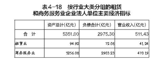 2023年末,租賃和商務(wù)服務(wù)業(yè)企業(yè)法人單位資產(chǎn)總計5351.00億元,比2018年末增長131.0%。其中,租賃業(yè)企業(yè)法人單位資產(chǎn)總計94.92億元,商務(wù)服務(wù)業(yè)企業(yè)法人單位資產(chǎn)總計5256.08億元,分別比2018年末增長412.0%和128.7%。租賃和商務(wù)服務(wù)業(yè)企業(yè)法人單位負(fù)債合計2975.30億元,比2018年末增長157.7%。