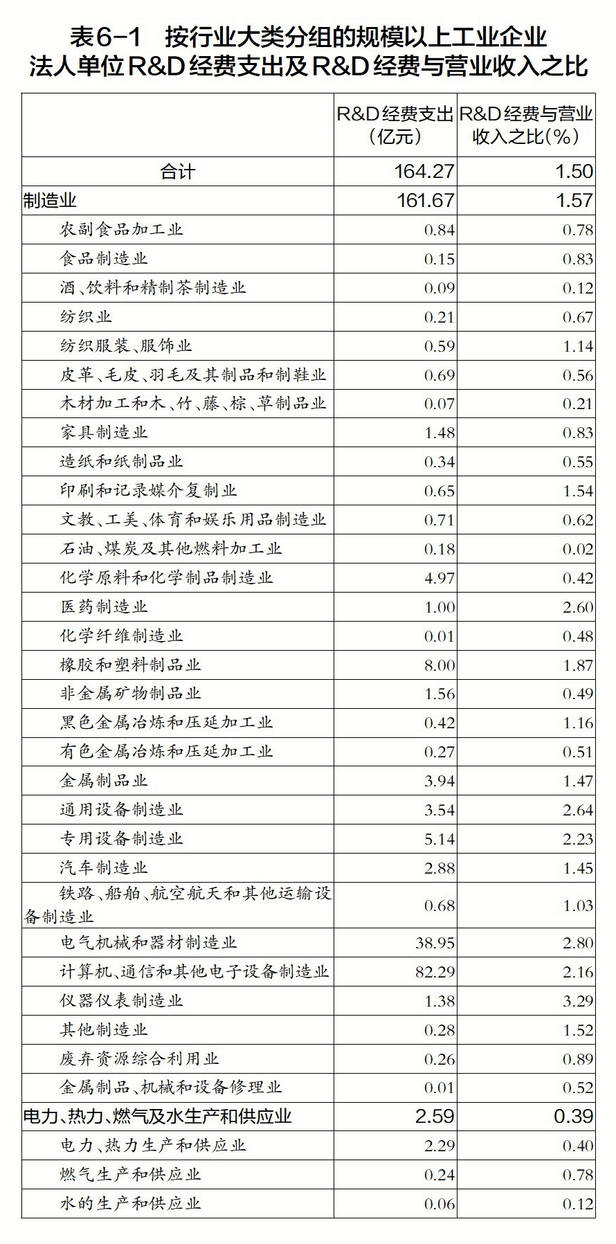 2023年,規(guī)模以上工業(yè)企業(yè)法人單位R&D經(jīng)費支出164.27億元,比2018年增長83.9%;R&D經(jīng)費與營業(yè)收入之比為1.5%。規(guī)模以上工業(yè)企業(yè)法人單位分行業(yè)R&D經(jīng)費支出及R&D經(jīng)費與營業(yè)收入之比詳見表6-1。