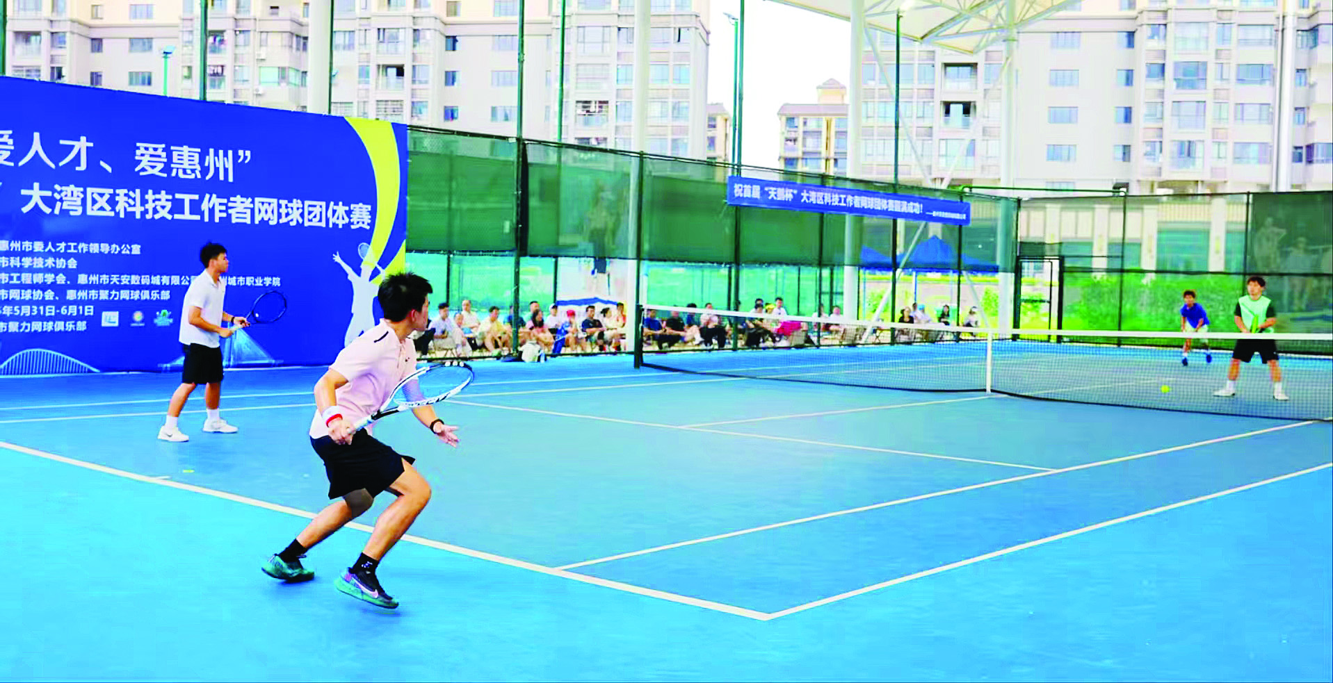 作為惠州主辦的首個(gè)面向大灣區(qū)科技工作者的專業(yè)網(wǎng)球賽事,本屆比賽創(chuàng)新設(shè)置第一男雙、第二男雙和混合雙打三大團(tuán)體項(xiàng)目。賽場上,選手們靈活跑位、默契配合,網(wǎng)前截?fù)簟⒌拙抽球等精彩場面不斷上演,場外觀眾熱情高漲,加油助威聲此起彼伏。