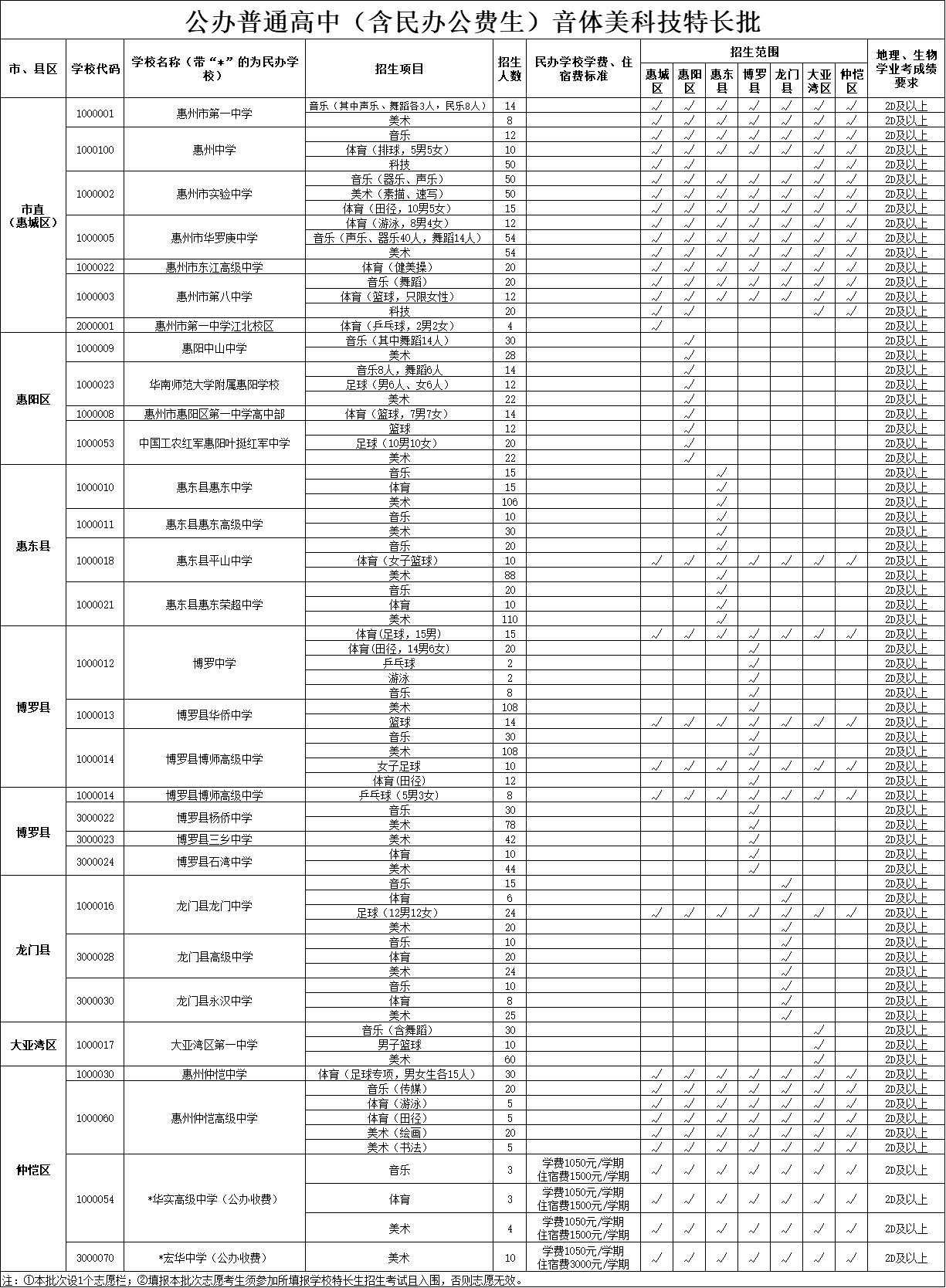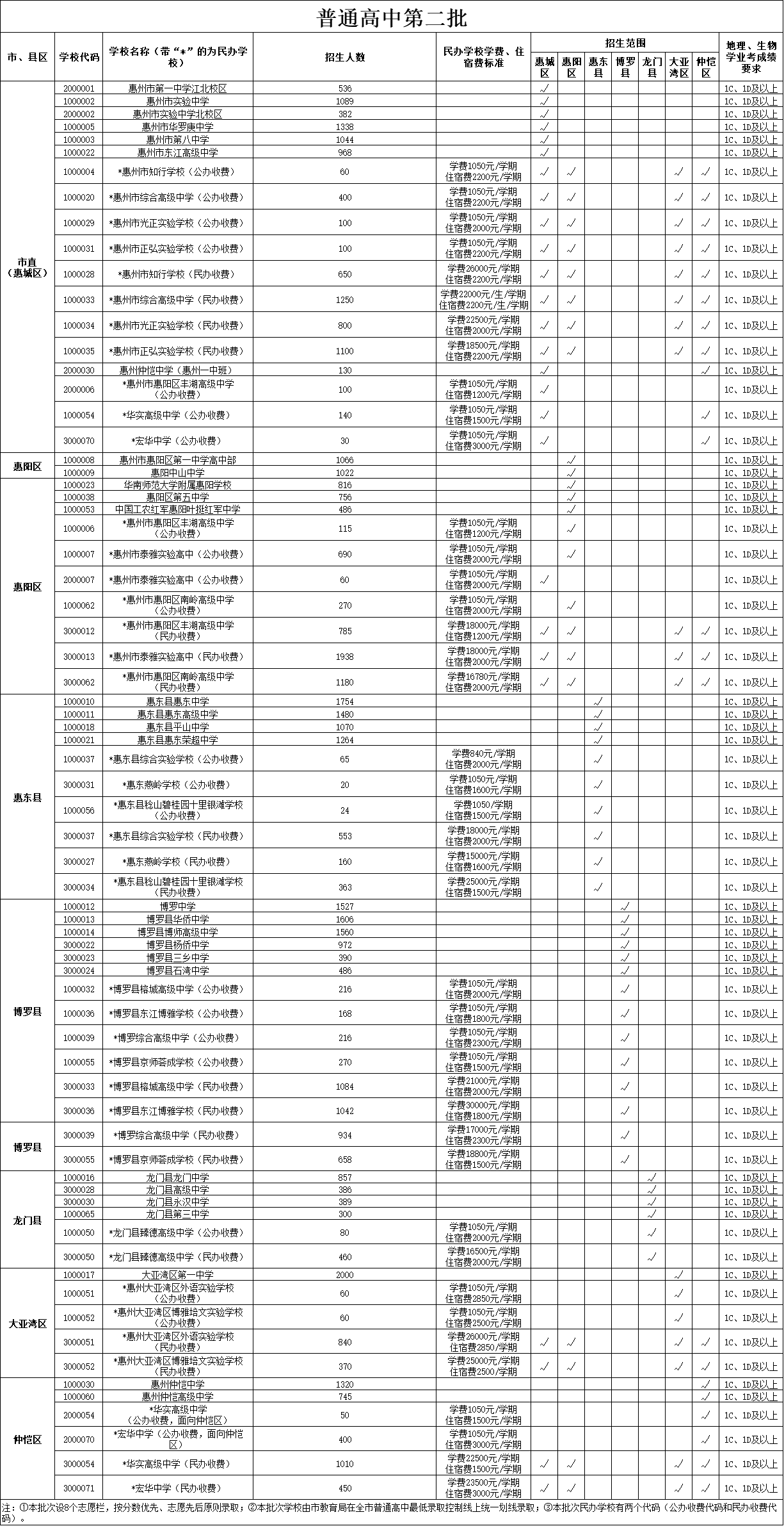 根據(jù)有關(guān)文件要求,今年惠州市將繼續(xù)貫徹落實國家和省有關(guān)屬地招生和公民同招等政策要求,在第二批招生的惠州市知行學(xué)校、惠州市綜合高級中學(xué)、惠州市光正實驗學(xué)校、惠州市正弘實驗學(xué)校等市直民辦普通高中學(xué)校主要面向四個區(qū)(惠城區(qū)、惠陽區(qū)、大亞灣區(qū)、仲愷區(qū))招生,各縣民辦普通高中學(xué)校主要面向本縣域招生。沒有完成招生計劃的民辦普通高中學(xué)校,在補(bǔ)錄志愿時,可面向全市進(jìn)行補(bǔ)錄。
