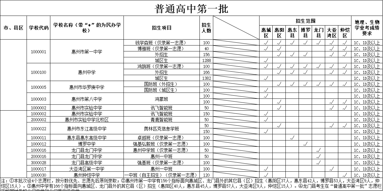 今年普通高中第一批設(shè)4個志愿欄,比去年多一個,屆時將按分?jǐn)?shù)優(yōu)先、志愿先后原則錄取。今年惠州市第一中學(xué)、惠州中學(xué)在龍門縣招生模式調(diào)整為聯(lián)合培養(yǎng)模式,故外招生指標(biāo)不含龍門縣。今年惠州市第一中學(xué)有156個外招指標(biāo),其中惠陽區(qū)37人、惠東縣42人、博羅縣53人、大亞灣區(qū)9人、仲愷區(qū)15人。惠州中學(xué)有166個外招指標(biāo),其中惠陽區(qū)40人、惠東縣45人、博羅縣57人、大亞灣區(qū)9人、仲愷區(qū)15人。需要注意的是,龍門縣考生在“普通高中第一批”志愿欄不能同時兼報龍門中學(xué)和龍門縣高級中學(xué)。