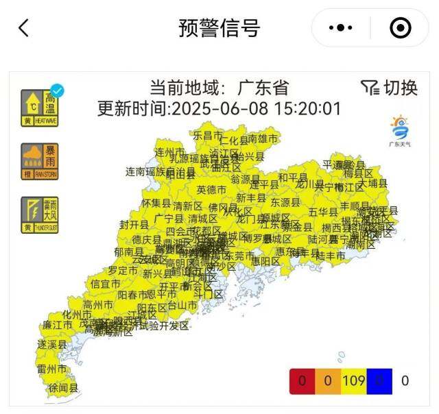 廣東掛出109個(gè)黃色高溫預(yù)警信號(hào)