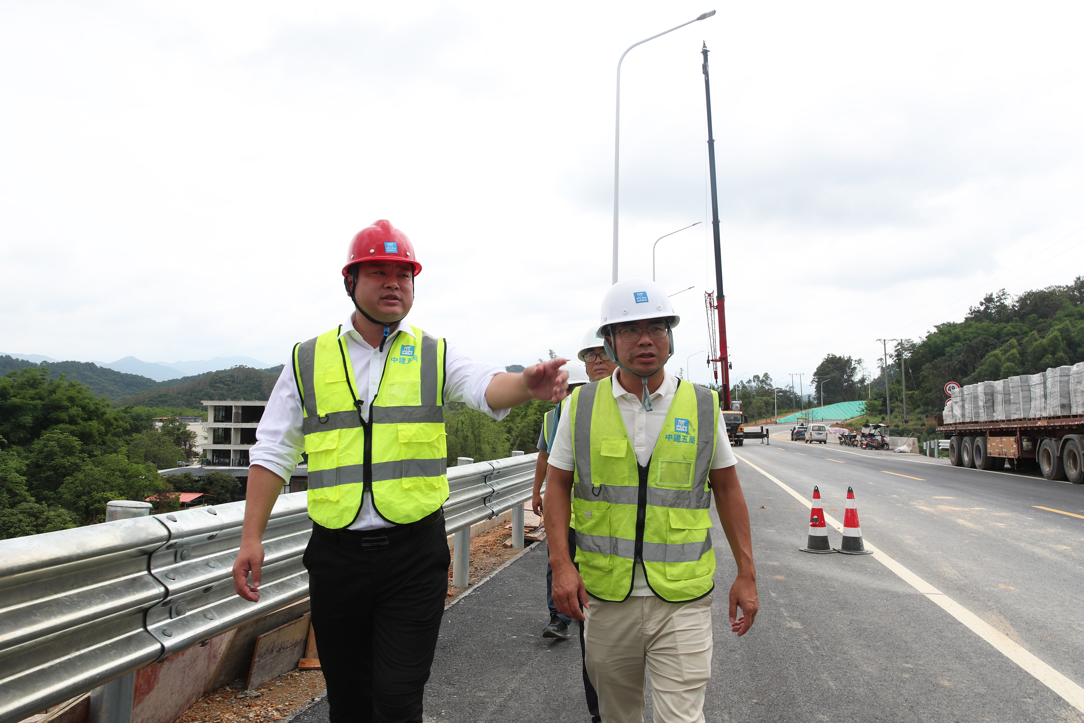許松(左一)在公路施工現(xiàn)場(chǎng)督戰(zhàn)。惠州日?qǐng)?bào)記者鐘暢新 攝