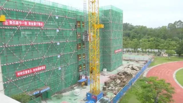 在惠州市第一中學(xué)江北校區(qū)項目建設(shè)現(xiàn)場,一側(cè)的教學(xué)樓搭滿了腳手架,將建筑層層包裹,工人們穿梭其間,為教學(xué)樓外觀與功能升級全力奮戰(zhàn)。