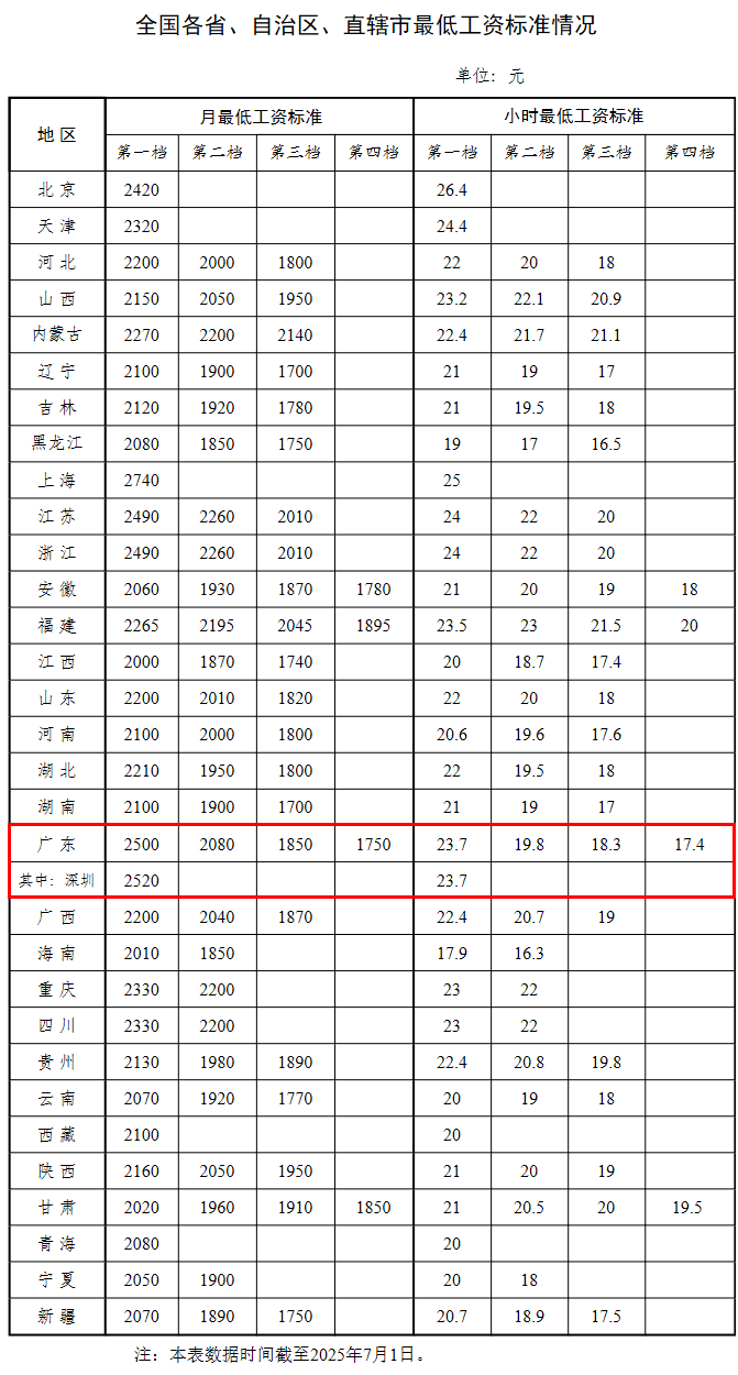 7月15日,人社部官網(wǎng)公布全國各省、自治區(qū)、直轄市最低工資標(biāo)準(zhǔn)情況(截至2025年7月1日)。其中,廣東四檔月最低工資標(biāo)準(zhǔn)分別是2500元、2080元、1850元和1750元。惠州執(zhí)行三類標(biāo)準(zhǔn),月最低工資標(biāo)準(zhǔn)為1850元/月。