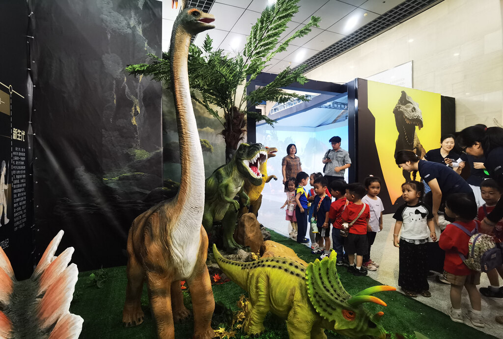 “這樣的主題展特別有趣!孩子們很好奇,大家既能系統(tǒng)學(xué)習(xí)恐龍相關(guān)知識,還可以深度參與體驗,感受遠(yuǎn)古時代的風(fēng)貌。”市民劉先生帶著兩個小孩前來參觀展覽,只見他一邊為孩子拍照打卡,一邊認(rèn)真講解恐龍相關(guān)科普知識。