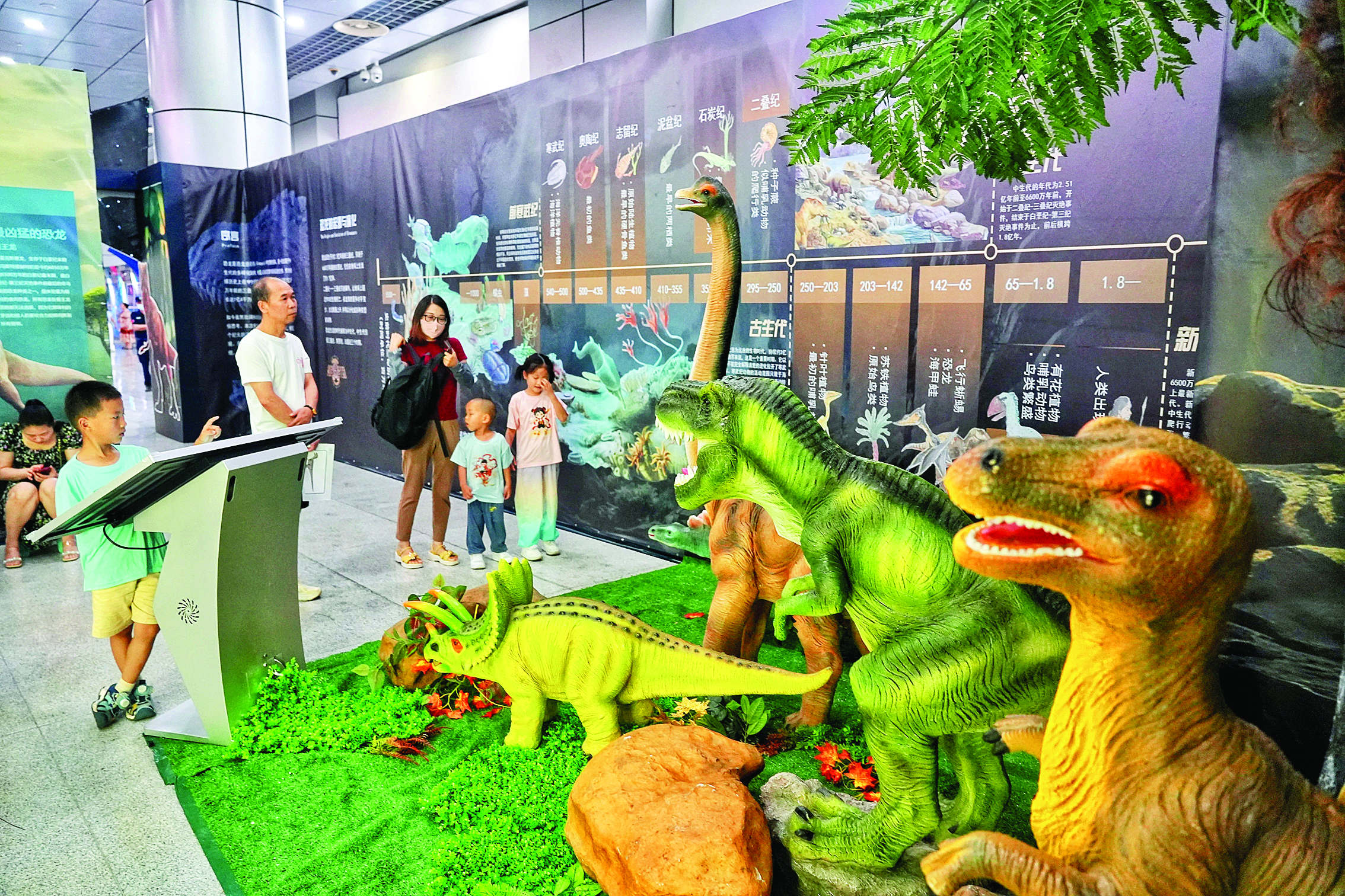“這樣的主題展特別有趣!孩子們很好奇,大家既能系統(tǒng)學習恐龍相關(guān)知識,還可以深度參與體驗,感受遠古時代的風貌。”市民劉先生帶著兩個孩子前來參觀展覽,只見他一邊為孩子拍照打卡,一邊認真講解恐龍相關(guān)科普知識。