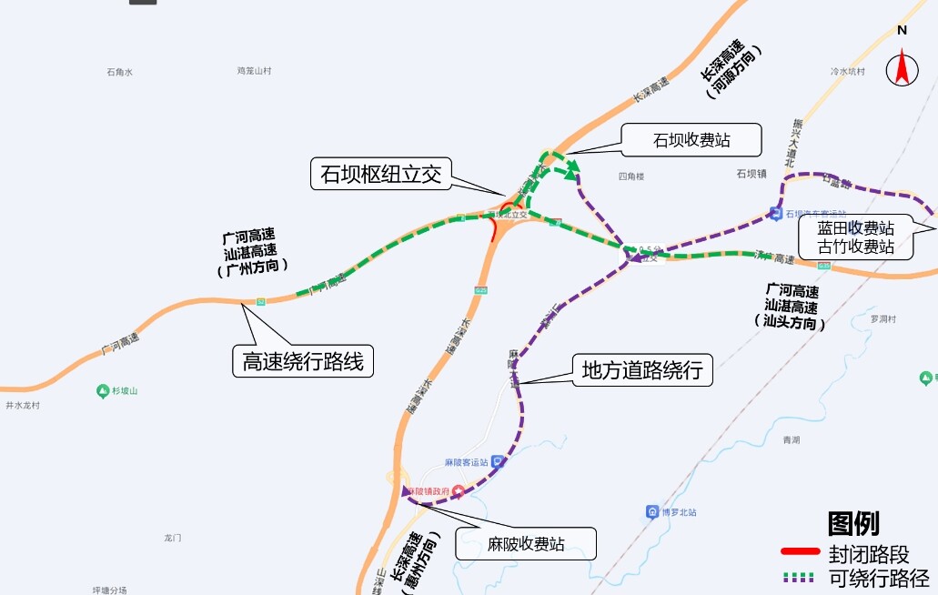 惠州交警建議,惠州往河源方向(北行)過境車輛,經(jīng)石壩北樞紐立交繞行惠龍高速、廣河高速、濟(jì)廣高速,廣龍高速行駛;河源往惠州方向(南行)過境車輛,經(jīng)石壩北樞紐立交繞行廣河高速,惠龍高速、濟(jì)廣高速、武深高速行駛;廣河高速、汕湛高速往長深高速惠州、河源方向的車輛,請繞行公莊收費(fèi)站、藍(lán)田收費(fèi)站、古竹收費(fèi)站下高速繞行地方道路通行。地方道路惠州往河源方向車輛,可提前通過楊村或麻陂收費(fèi)站駛離高速,繞行G205國道。