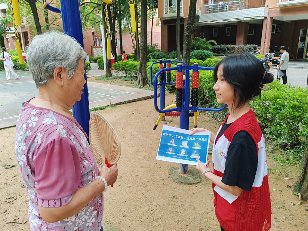 在一幢樓房的架空層,3位長者正坐在一起聊天,志愿者熱情上前進(jìn)行宣傳。“爺爺,夏天蚊子多,可能會傳播基孔肯雅熱,你們在家里要清除積水,做好防蚊措施。”志愿者劉家宜把防蚊措施一一介紹給長者們聽。“謝謝志愿者,你們做得很棒,我們知道了。”長者們接過防蚊宣傳單并點贊志愿者。
