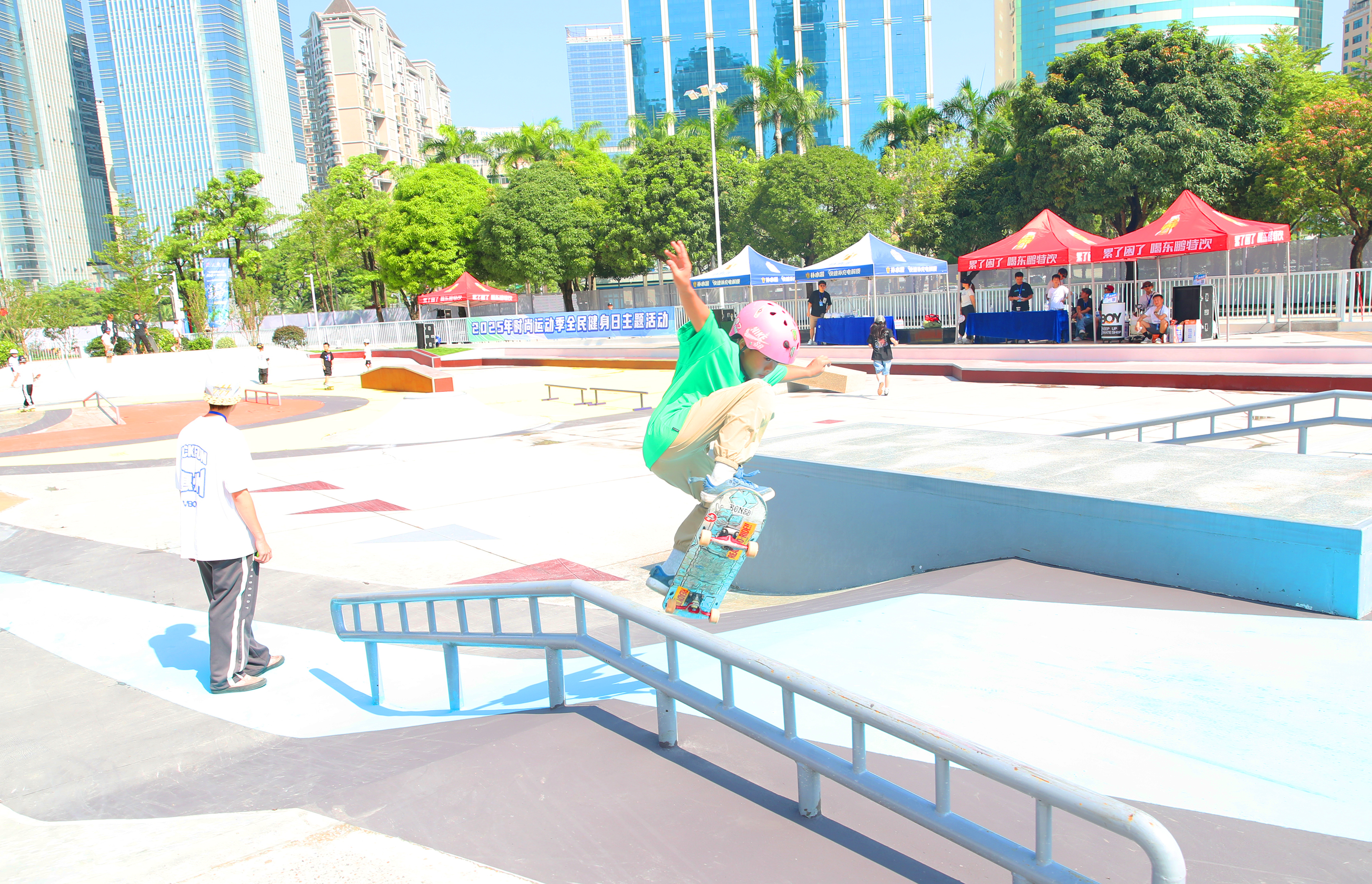在惠州體育館東一門外的滑板區(qū),新落成的滑板場吸引眾多愛好者,不少青少年在專業(yè)教練指導(dǎo)下初次嘗試滑板,體驗“貼地飛行”的快感。