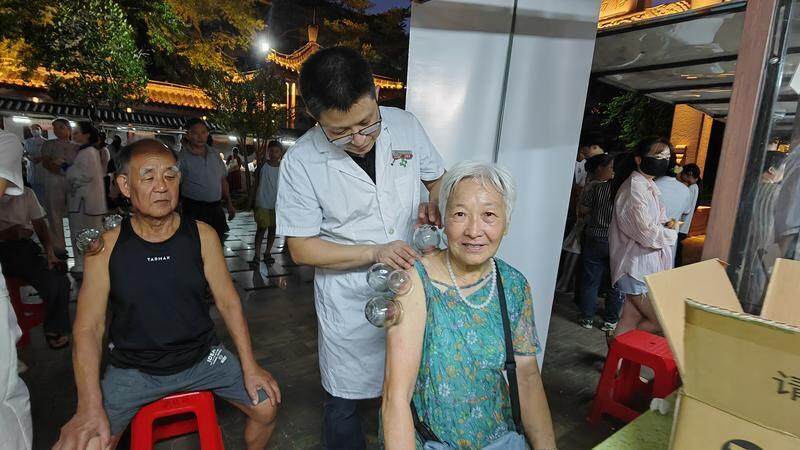 老人家在“健康夜市”現(xiàn)場拔火罐。