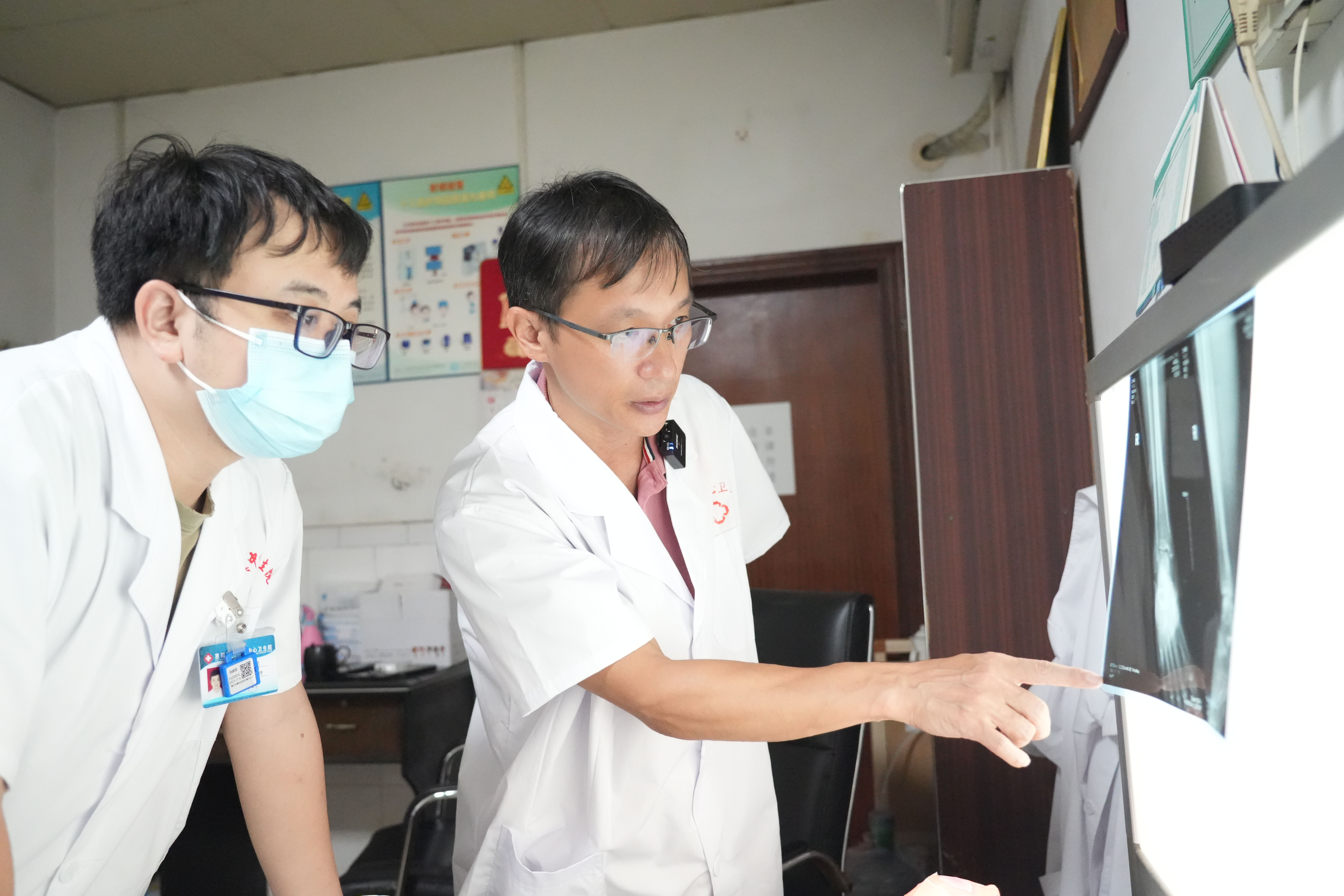 吳世祥(右)指導(dǎo)新圩鎮(zhèn)中心衛(wèi)生院放射科醫(yī)生進行影像診斷。 惠州日報記者許文昌 攝