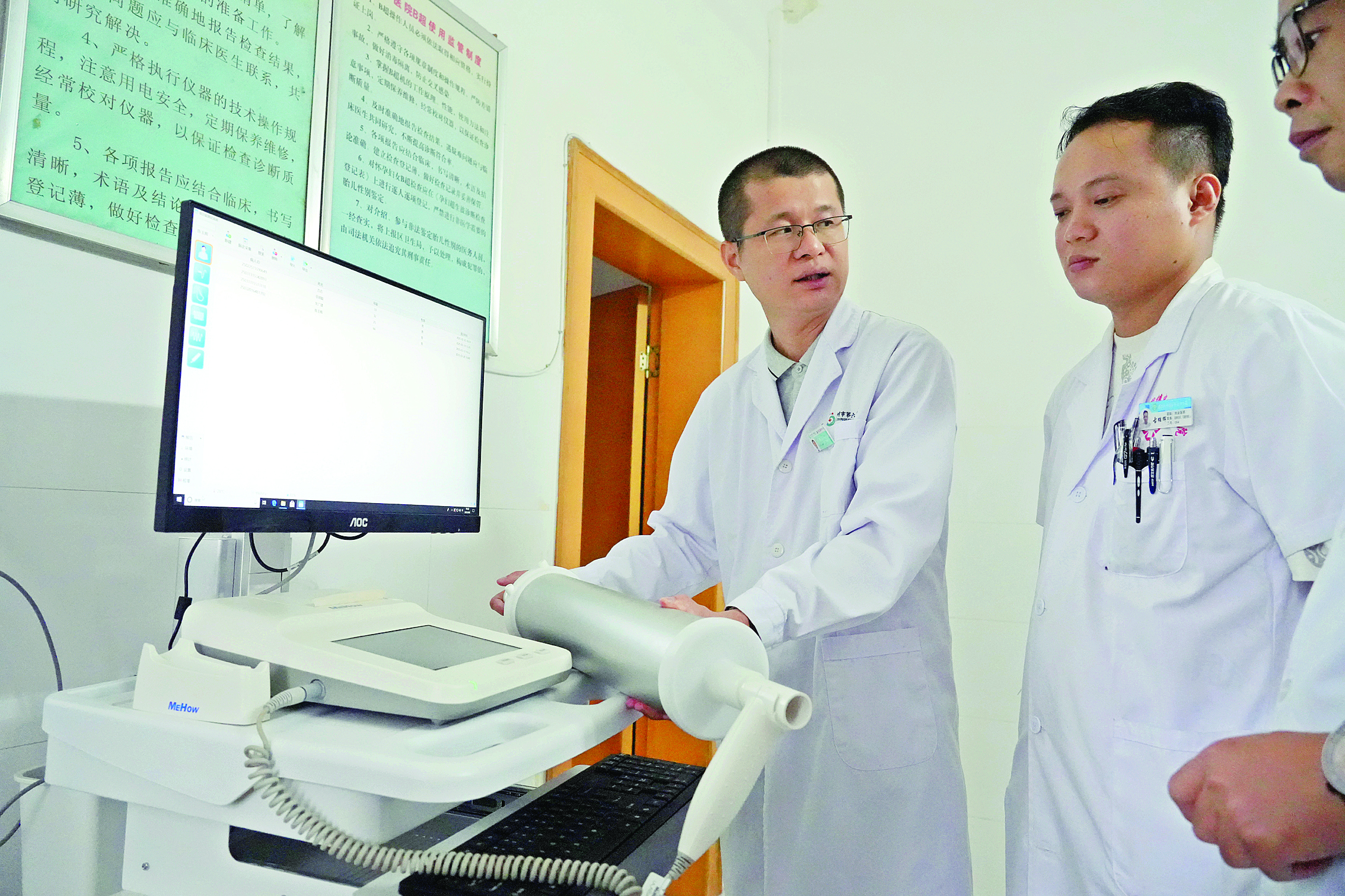 葉日康(左一)指導沙田鎮(zhèn)中心衛(wèi)生院醫(yī)生規(guī)范使用醫(yī)療設備。 惠州日報記者許文昌 攝