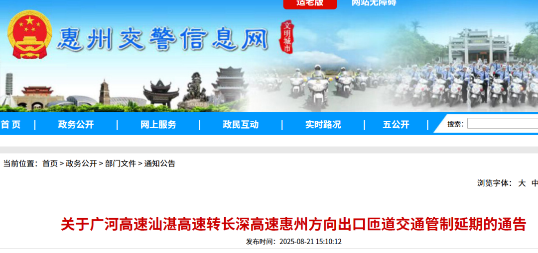 廣河高速、汕湛高速轉(zhuǎn)長(zhǎng)深高速惠州方向出口匝道封閉施工,禁止車輛通行。交通管制時(shí)間延期至2025年8月31日10:00。